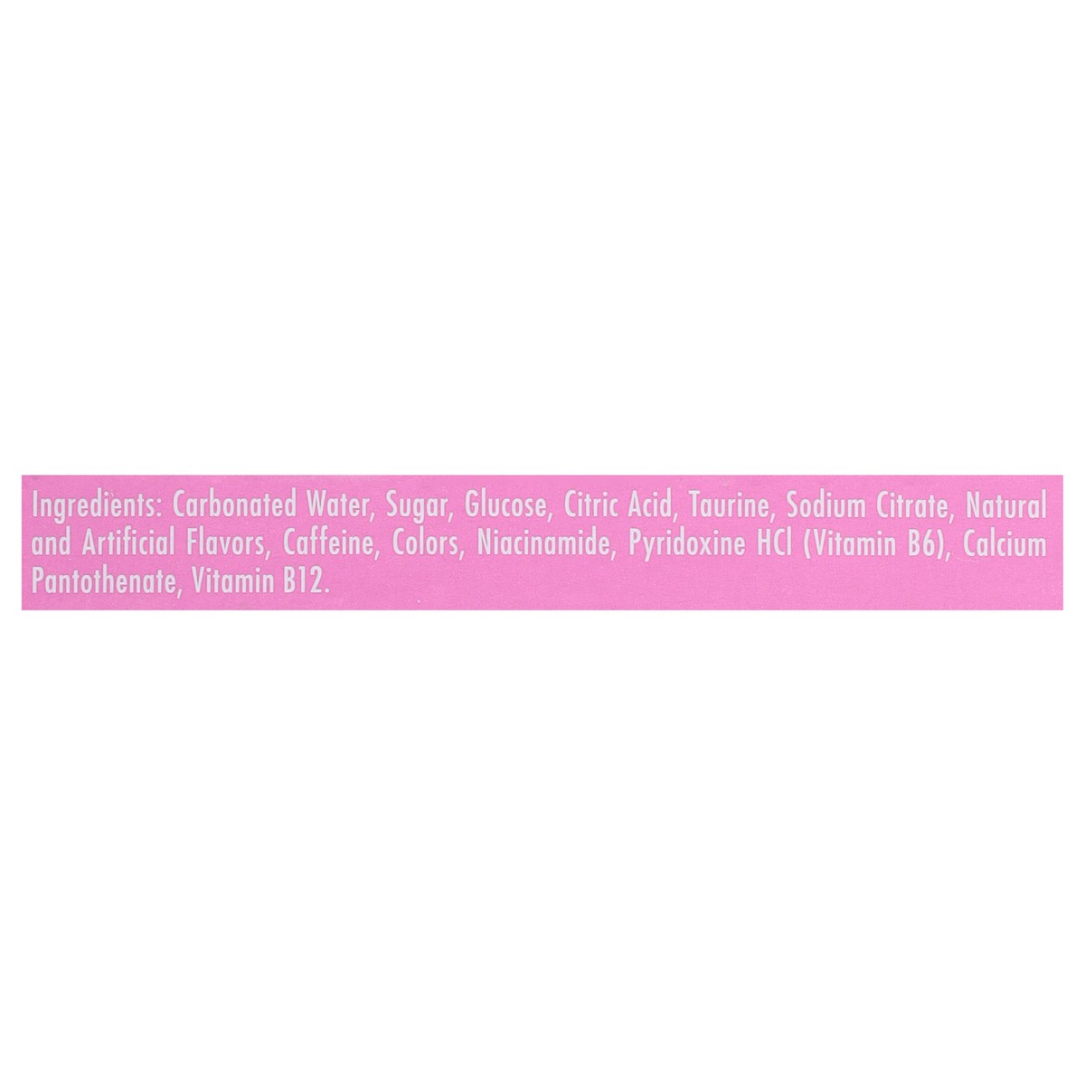 Carbonated Water, Sugar, Glucose, Citric Acid, Taurine, Sodium Citrate, Natural and Artificial Flavors, Caffeine, Colors, Niacinamide, Pyridoxine HCl (Vitamin B6), Calcium Pantothenate, Vitamin B12.