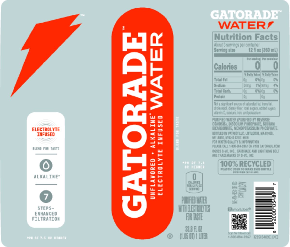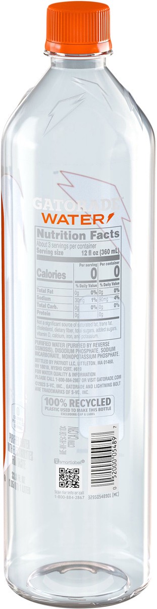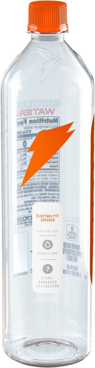 Purified water with electrolytes for taste. 0 calories per 12 fl oz serving. Electrolyte infused blend for taste. Alkaline (ph of 7.5 or higher). 7 steps enhanced filtration. gatorade.com. SmartLabel:…