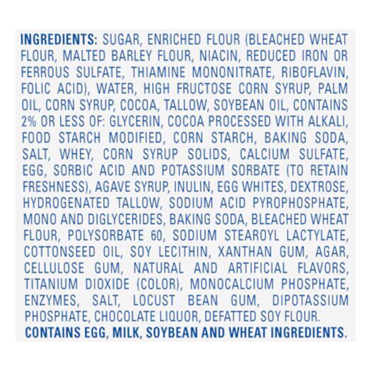 Sugar, Enriched Flour (Bleached Wheat Flour, Malted Barley Flour, Niacin, Reduced Iron or Ferrous Sulfate, Thiamine Mononitrate, Riboflavin, Folic Acid), Water, High Fructose Corn Syrup, Palm Oil, Cor…