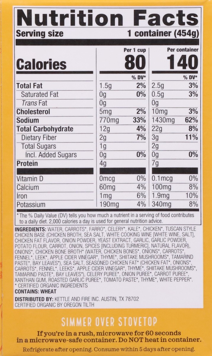Water, Carrots (Certified Organic Ingredients), Farro (Certified Organic Ingredients), Celery (Certified Organic Ingredients), Kale (Certified Organic Ingredients), Chicken (Certified Organic Ingredie…