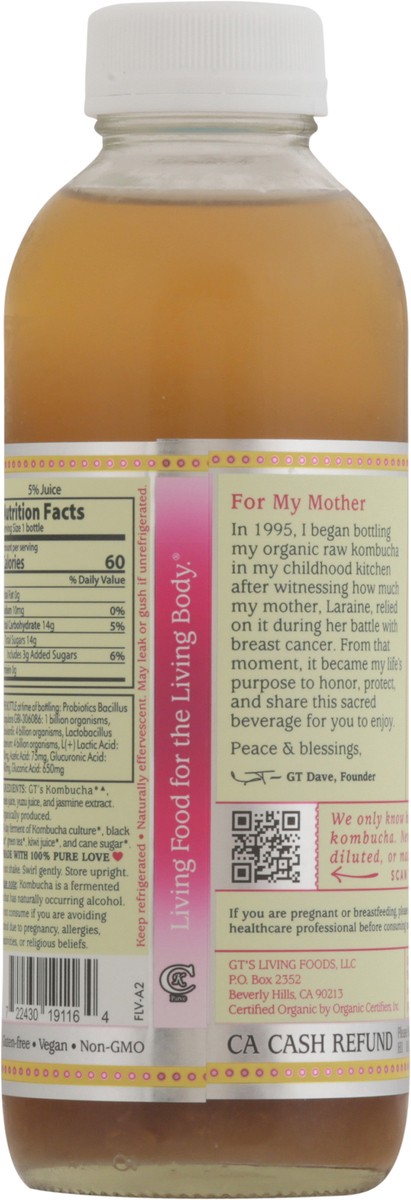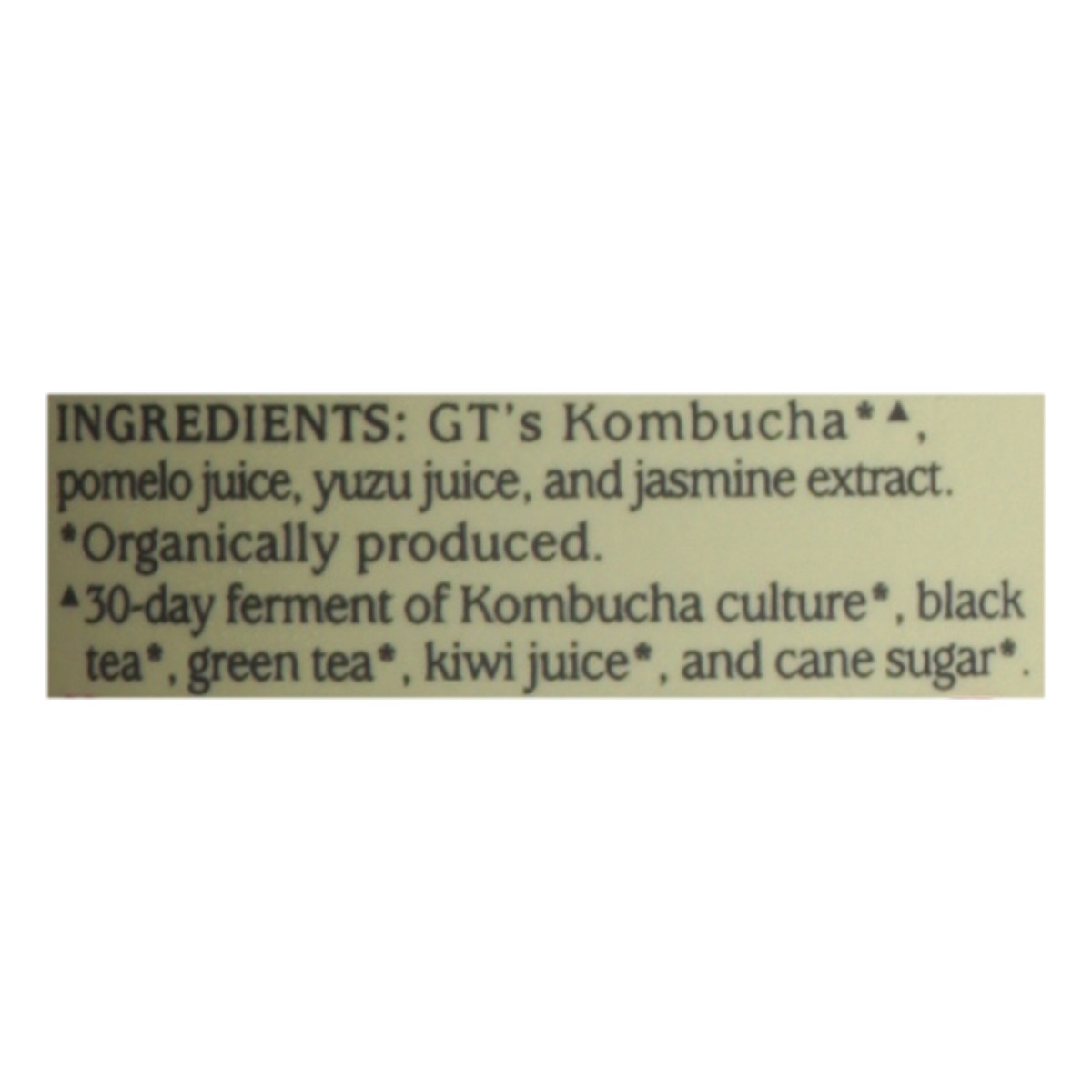 GT''s Kombucha (b)(c), Pomelo Juice, Yuzu Juice, and Jasmine Extract, Black Tea (b), Green Tea (b), Kiwi Juice (b), and Cane Sugar (b). (b) Organically Produced. (c) 30-Day Ferment of Kombucha Culture…
