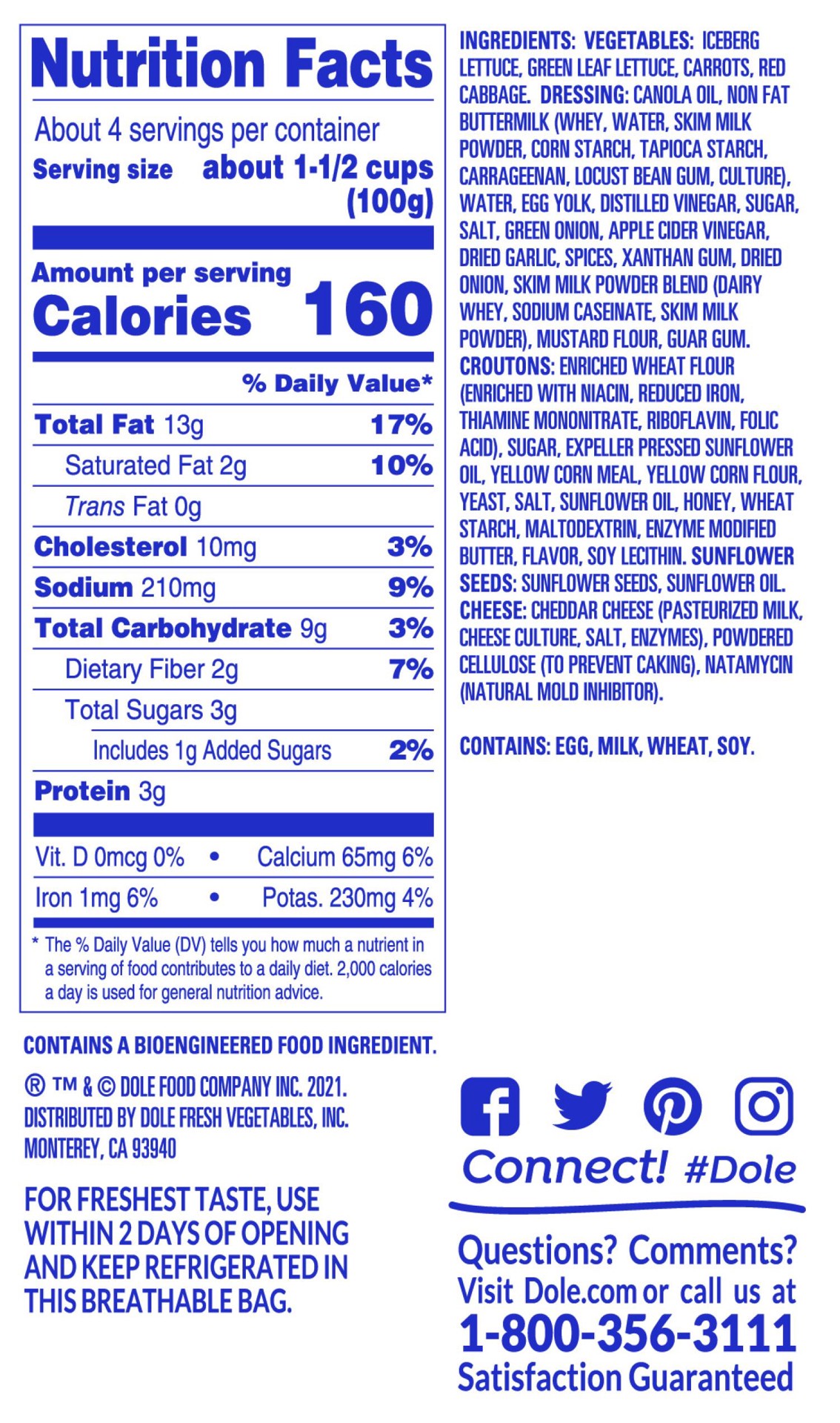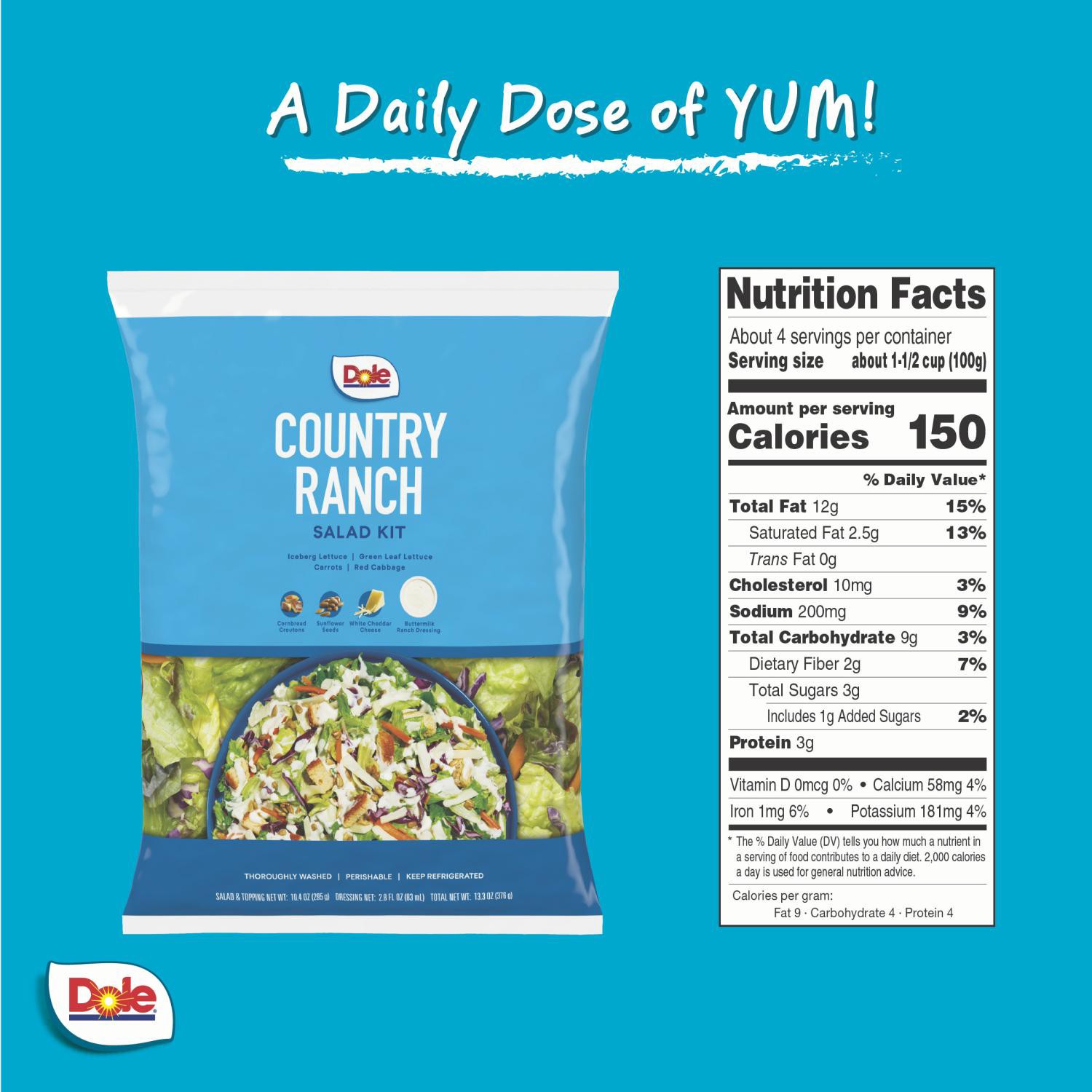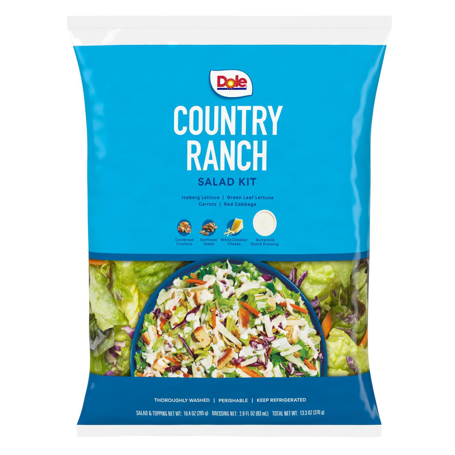 Dole's Country Ranch Salad Kit brings America's favorite dressing flavor together with savory cornbread croutons, artisan-cut white cheddar cheese, crispy Romaine lettuce, colorful fresh cut veggies a…
