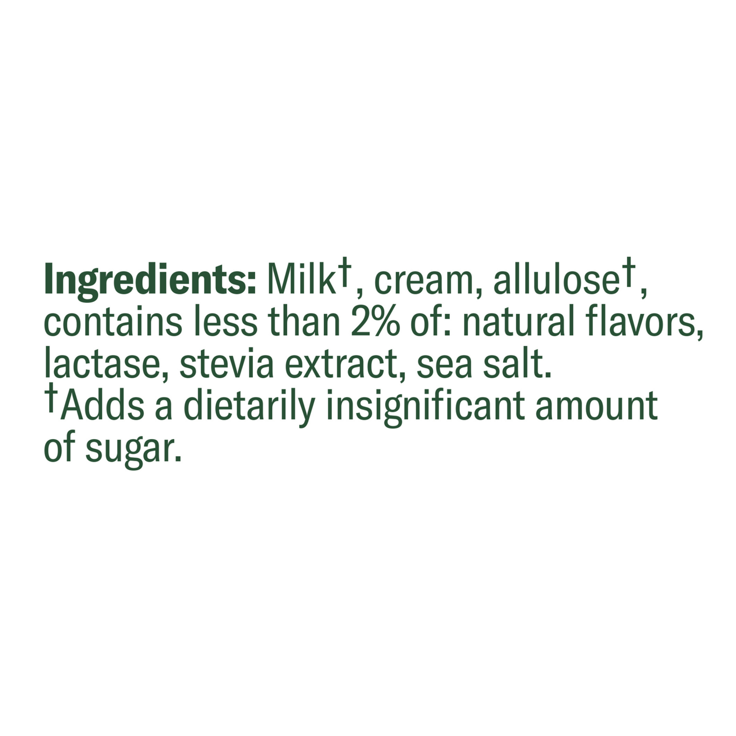 Milk (Adds a Dietarily Insignificant Amount of Sugar), Cream, Allulose (Adds a Dietarily Insignificant Amount of Sugar), Contains Less than 2% of Natural Flavors, Lactase, Stevia Extract, Sea Salt.