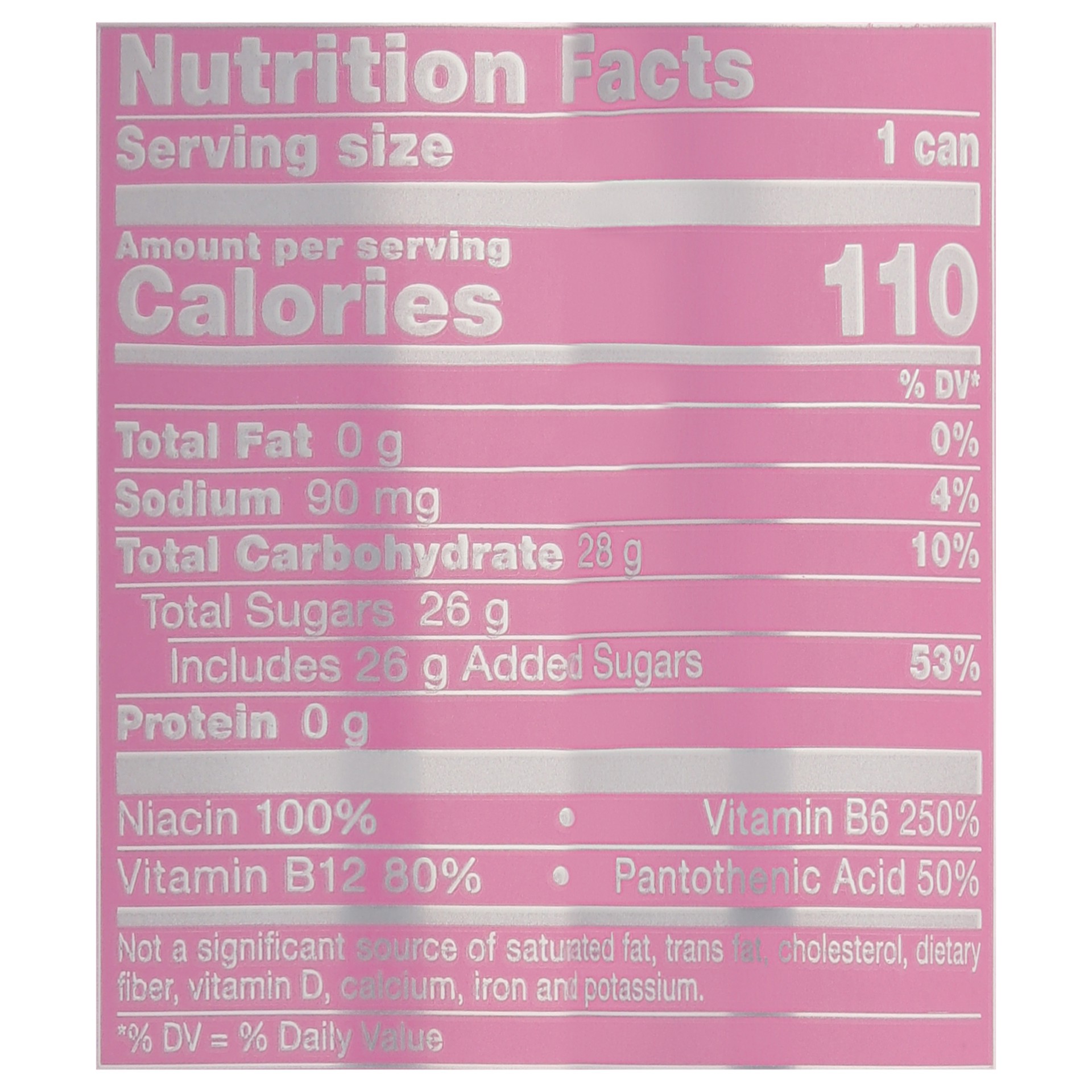 Carbonated Water, Sugar, Glucose, Citric Acid, Taurine, Sodium Citrate, Natural and Artificial Flavors, Caffeine, Colors, Niacinamide, Pyridoxine HCl (Vitamin B6), Calcium Pantothenate, Vitamin B12.