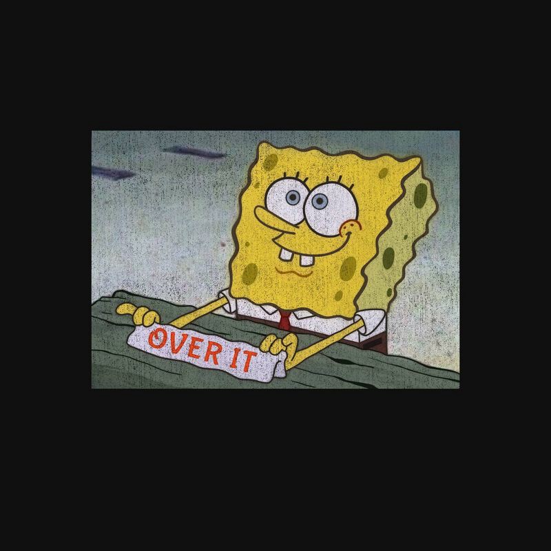 - Black hue with classic SpongeBob meme frame edited so sign reads "over it"