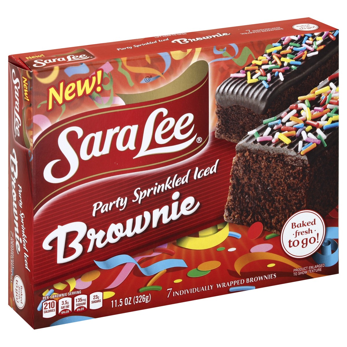 New! Per 1 Brownie Serving: 210 calories; 3.5 g sat fat (18% DV); 135 mg sodium (6% DV); 23 g sugars. 7 individually wrapped brownies. Baked fresh to go! For more information please visit us at: Saral…
