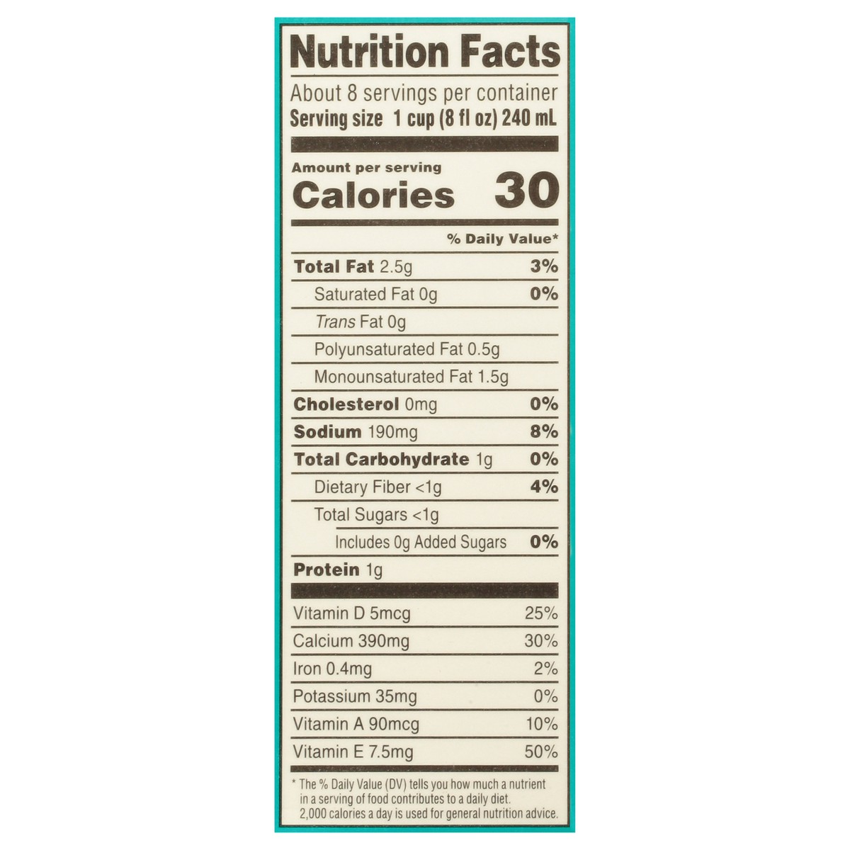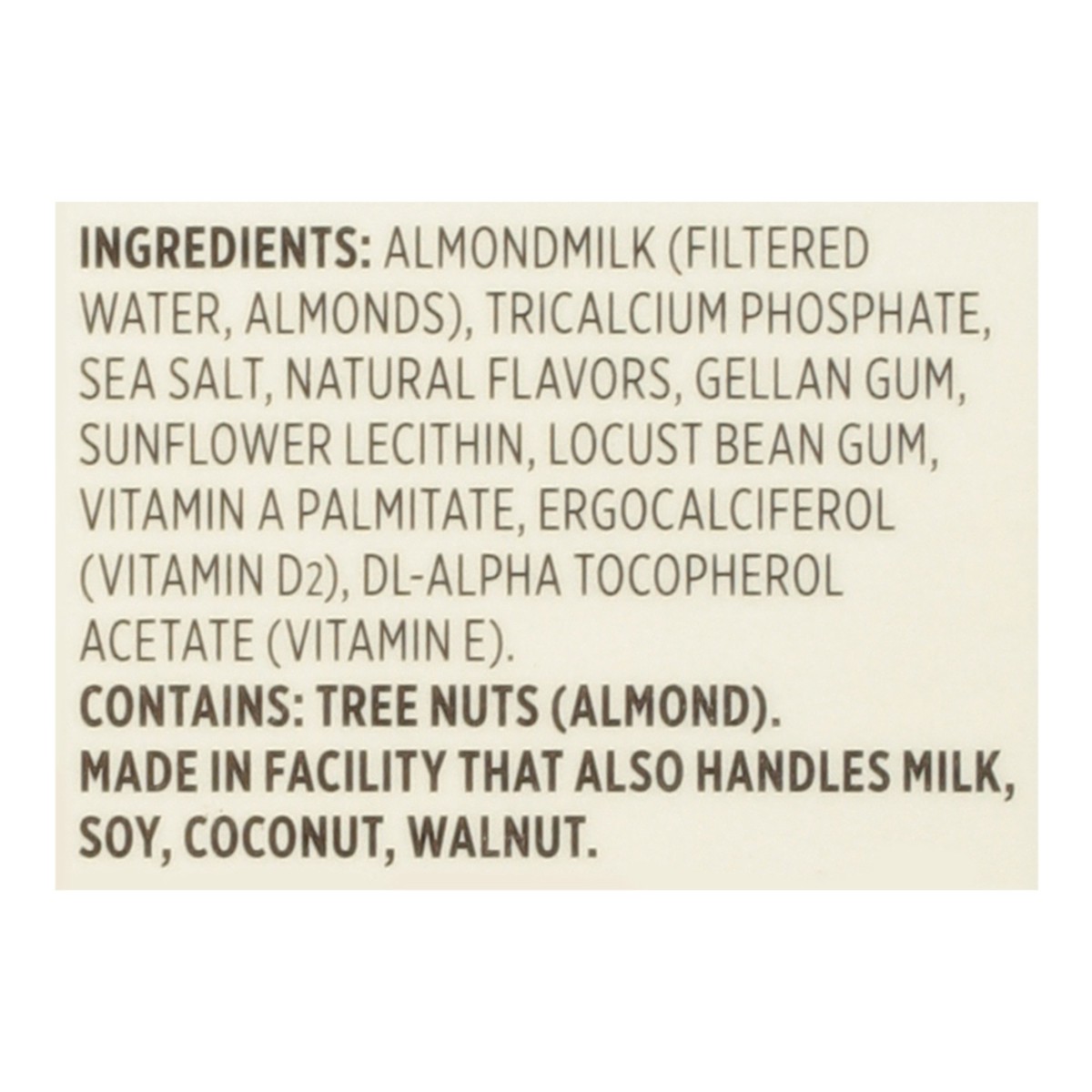 Almondmilk (Filtered Water, Almonds), Tricalcium Phosphate, Sea Salt, Natural Flavors, Gellan Gum, Sunflower Lecithin, Locust Bean Gum, Vitamin A Palmitate, Ergocalciferol (Vitamin D2), DL-Alpha Tocop…