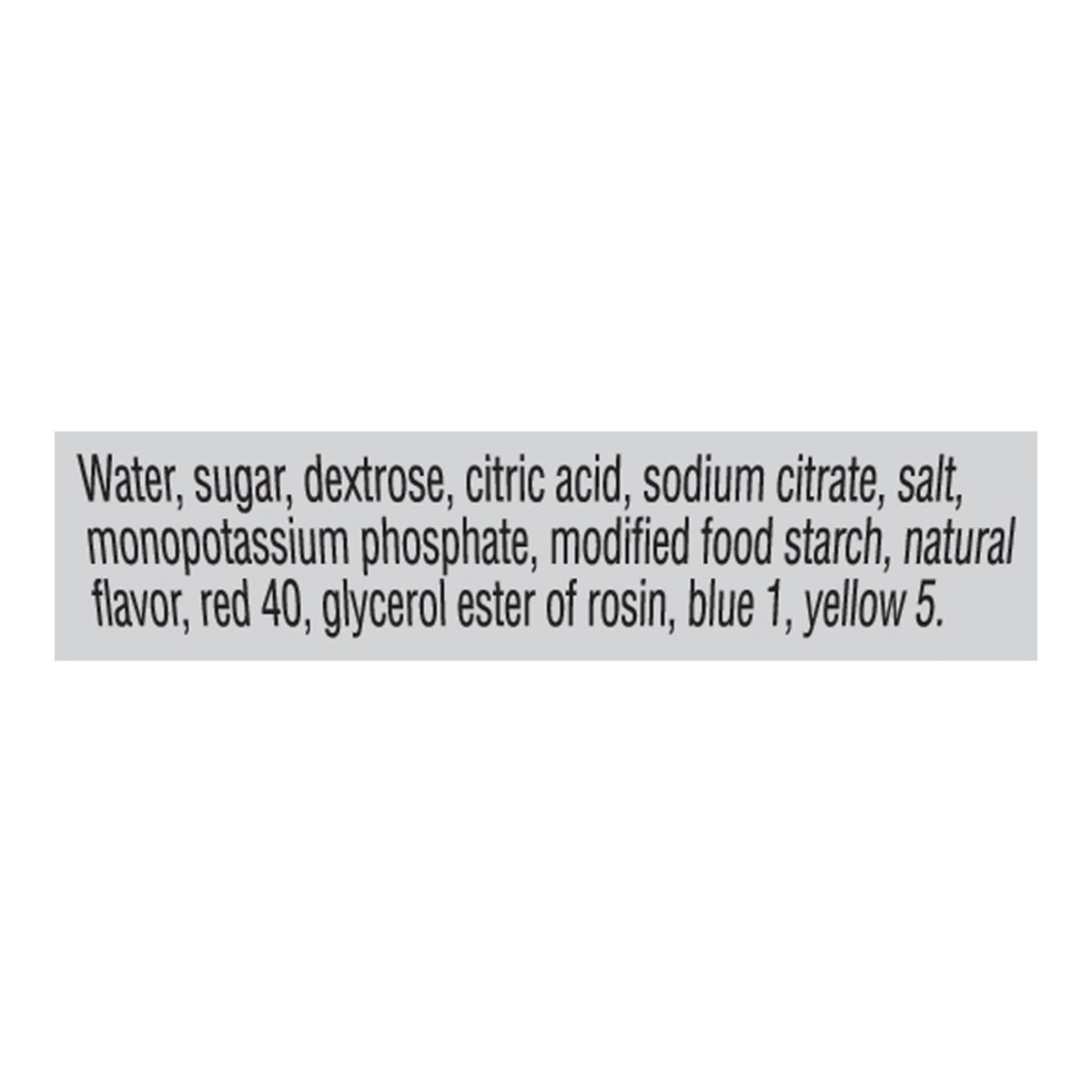 Water, Sugar, Dextrose, Citric Acid, Sodium Citrate, Salt, Monopotassium Phosphate, Modified Food Starch, Natural Flavor, Red 40, Glycerol Ester of Rosin, Blue 1, Yellow 5.