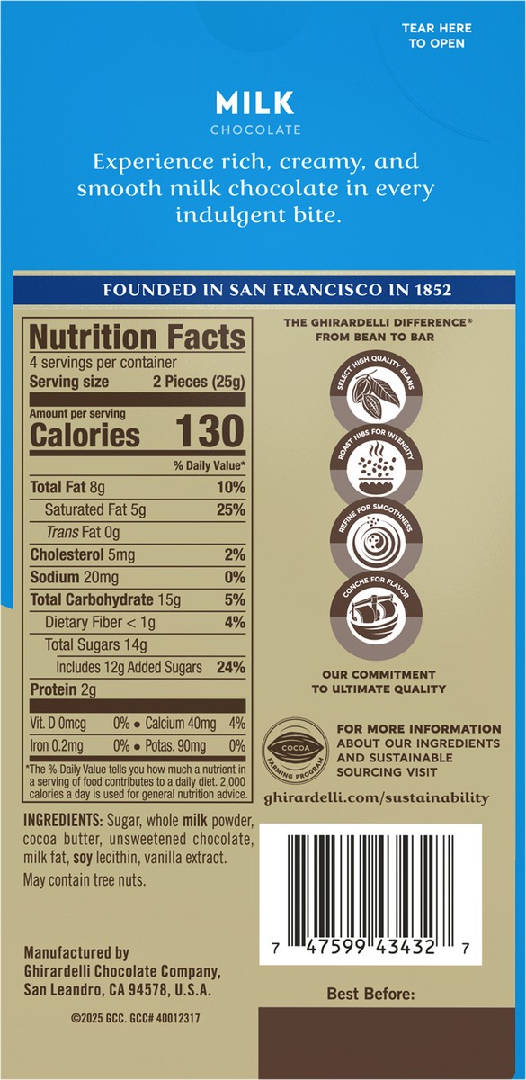Delight in the smooth, rich flavor of GHIRARDELLI® Premium Milk Chocolate Bar for a sweet treat. Experience rich, creamy, and smooth milk chocolate in every indulgent bite. Perfect for a quiet moment …