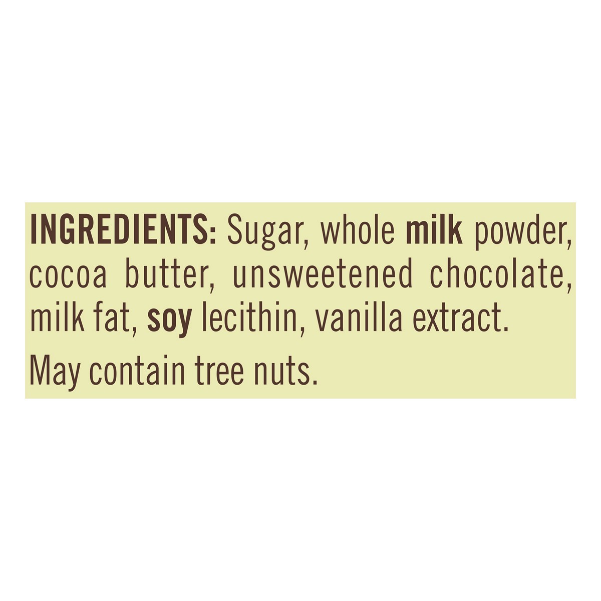Sugar, Whole Milk Powder, Cocoa Butter, Unsweetened Chocolate, Milk Fat, Soy Lecithin, Vanilla Extract.