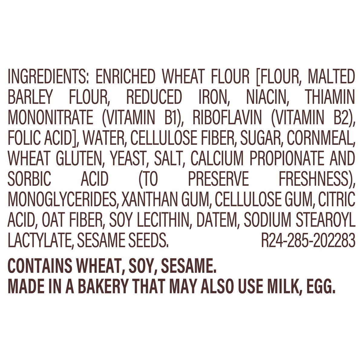 Enriched Wheat Flour [Flour, Malted Barley Flour, Reduced Iron, Niacin, Thiamin Mononitrate (Vitamin B1), Riboflavin (Vitamin B2), Folic Acid], Water, Cellulose Fiber, Sugar, Cornmeal, Wheat Gluten, Y…