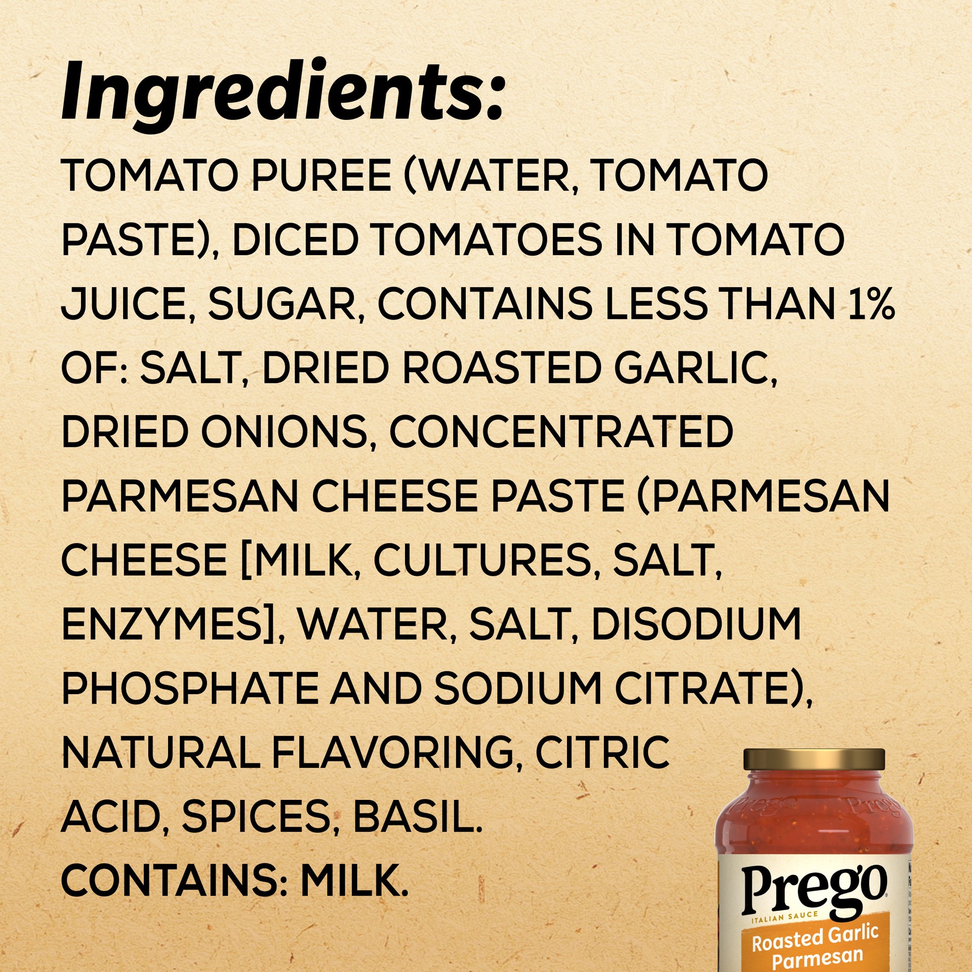 INGREDIENTS: TOMATO PUREE (WATER, TOMATO PASTE), DICED TOMATOES IN TOMATO JUICE, SUGAR, CONTAINS LESS THAN 1% OF: SALT, DRIED ROASTED GARLIC, DRIED ONIONS, CONCENTRATED PARMESAN CHEESE PASTE (PARMESAN…