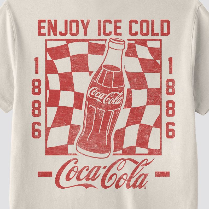 - Off-white color with vintage Coca-Cola graphics on front and back