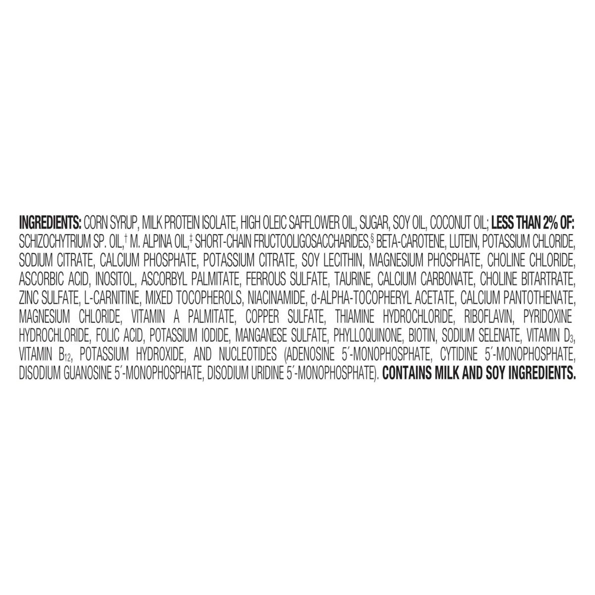 Corn Syrup, Milk Protein Isolate, High Oleic Safflower Oil, Sugar, Soy Oil, Coconut Oil; Less than 2% of: Schizochytrium Sp. Oil (Source of DHA) M, Alpina Oil (Source of ARA), Short-Chain Fructooligos…