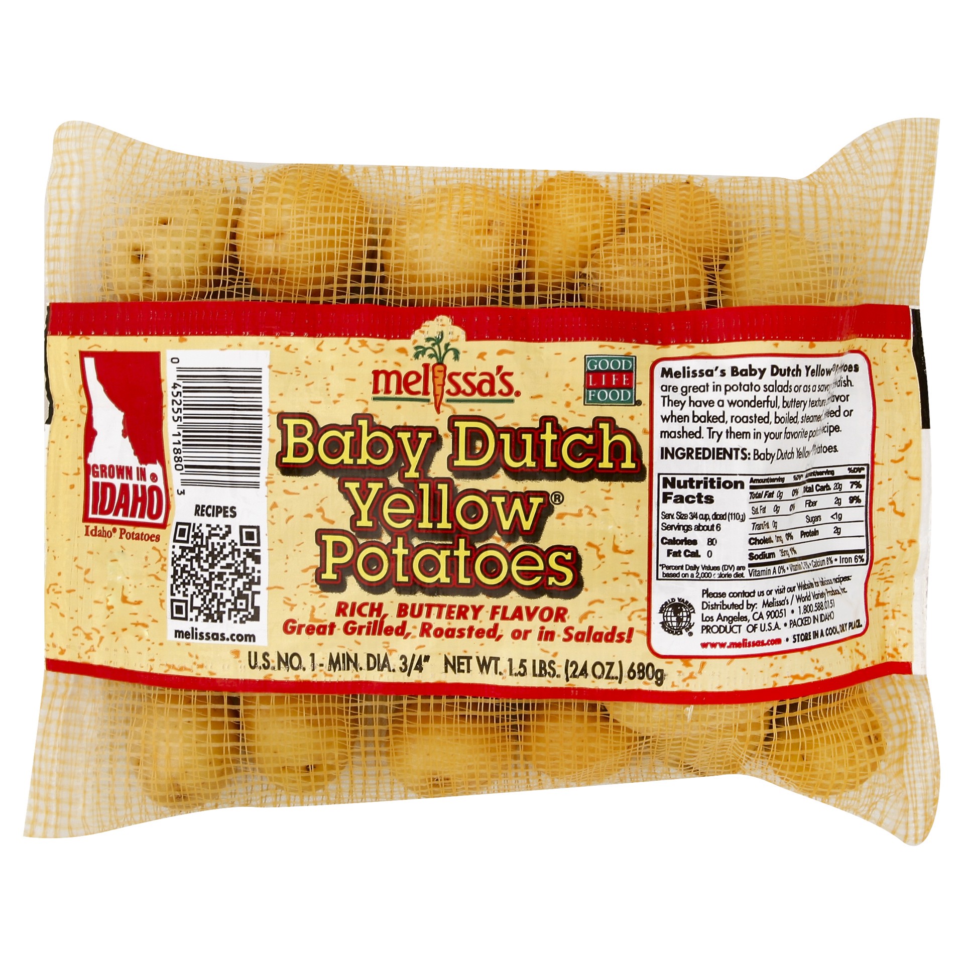 US. No. 1 - min. dia. 3/4 inch. Rich, buttery flavor. Great grilled, roasted, or in salads! Good life food. Recipes - melissas.com. Melissa's Baby Dutch Yellow Potatoes are great in potato salads or a…