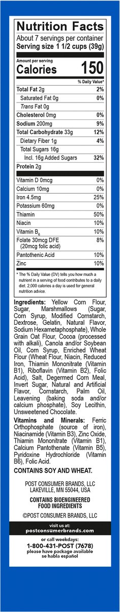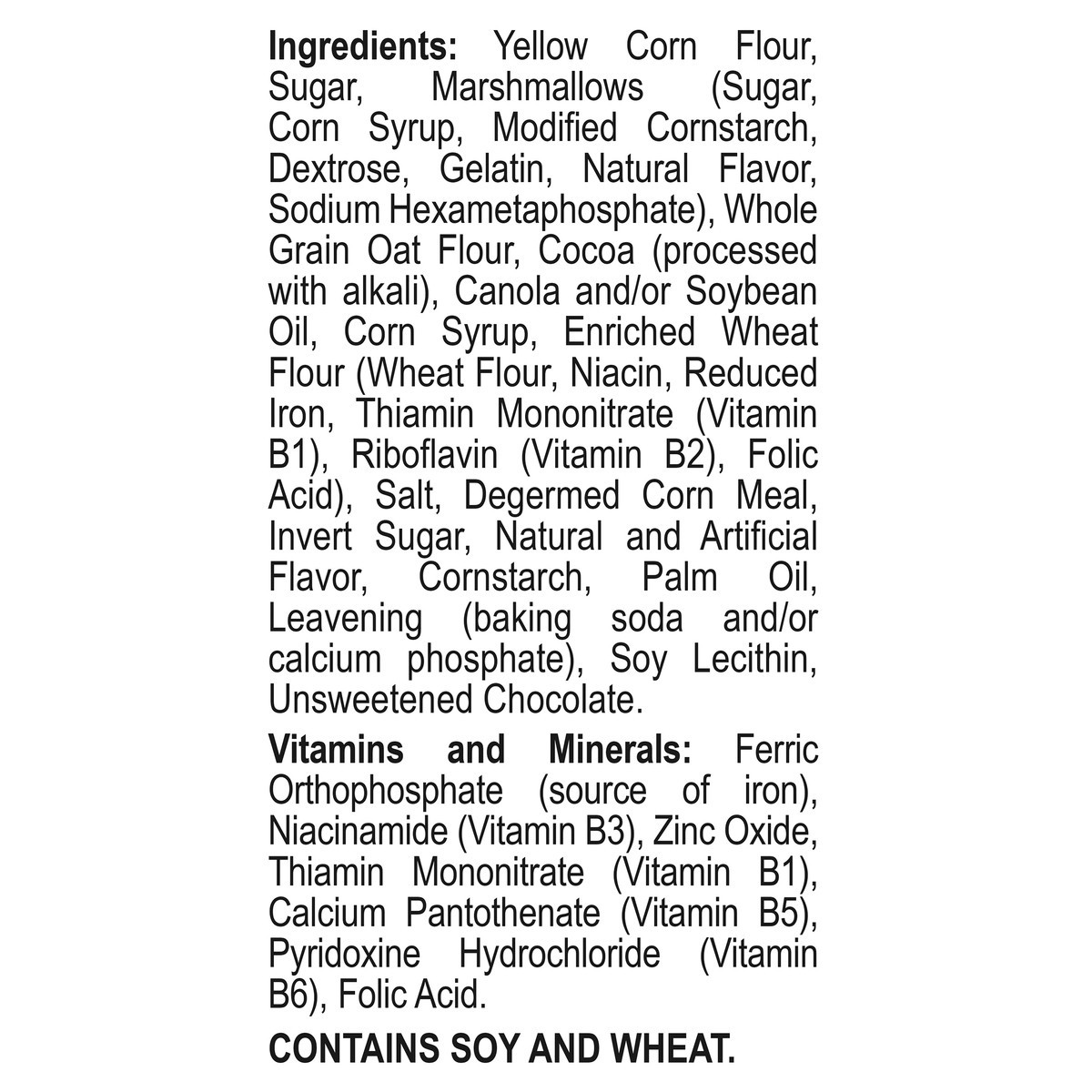 Yellow Corn Flour, Sugar, Marshmallows (Sugar, Corn Syrup, Modified Cornstarch, Dextrose, Gelatin, Natural Flavor, Sodium Hexametaphosphate), Whole Grain Oat Flour, Cocoa (Processed with Alkali), Cano…