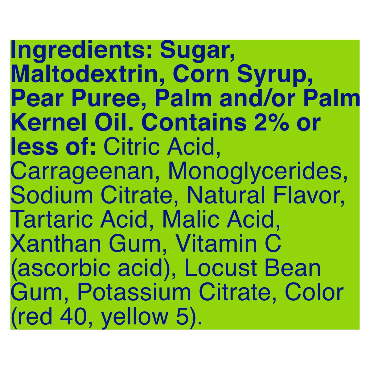 Sugar, Maltodextrin, Corn Syrup, Pear Puree, Palm and/or Palm Kernel Oil. Contains 2% or Less of: Citric Acid, Carrageenan, Monoglycerides, Sodium Citrate, Natural Flavor, Tartaric Acid, Malic Acid, X…