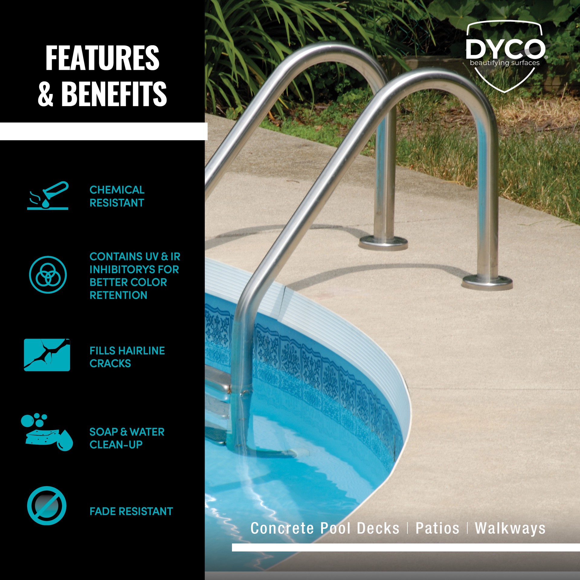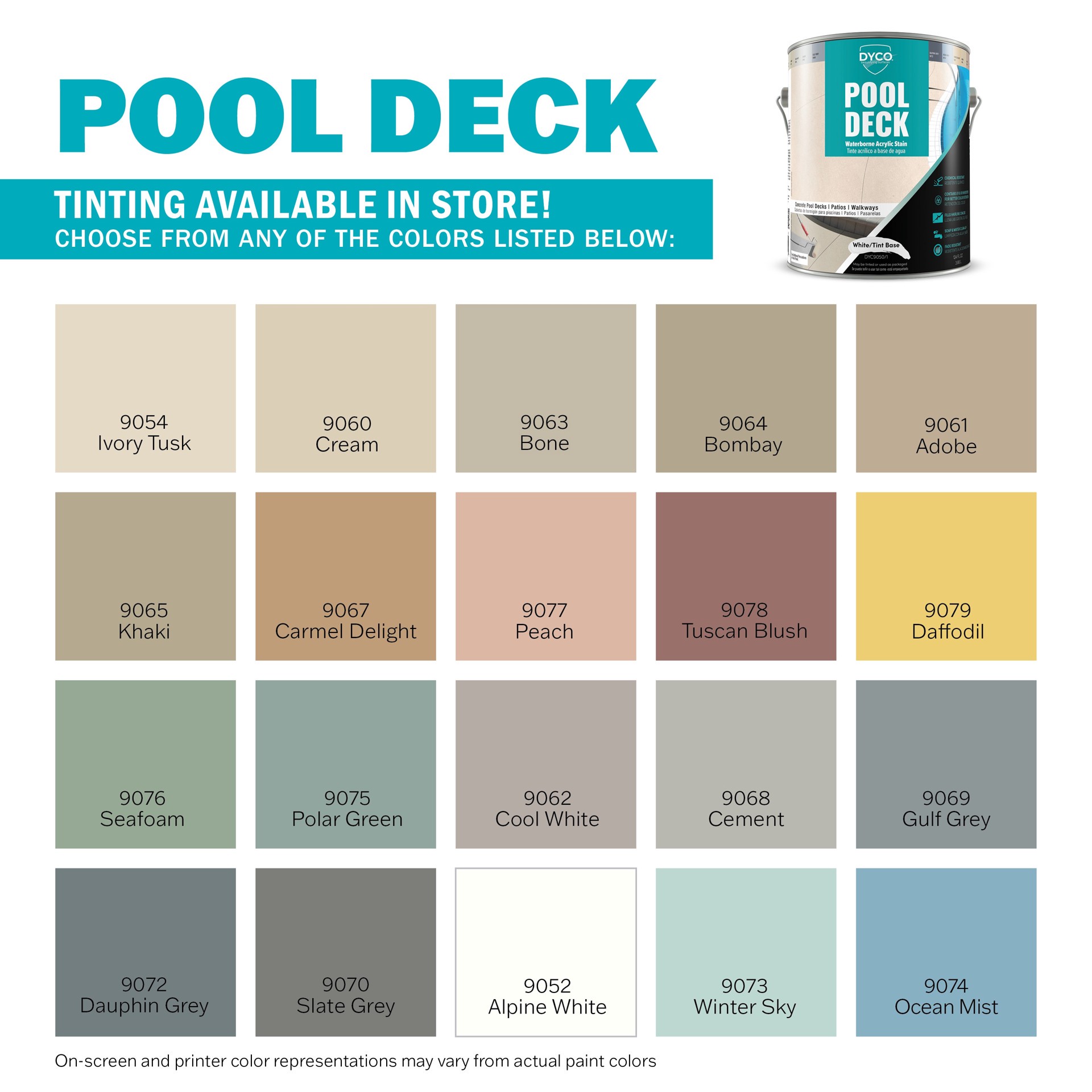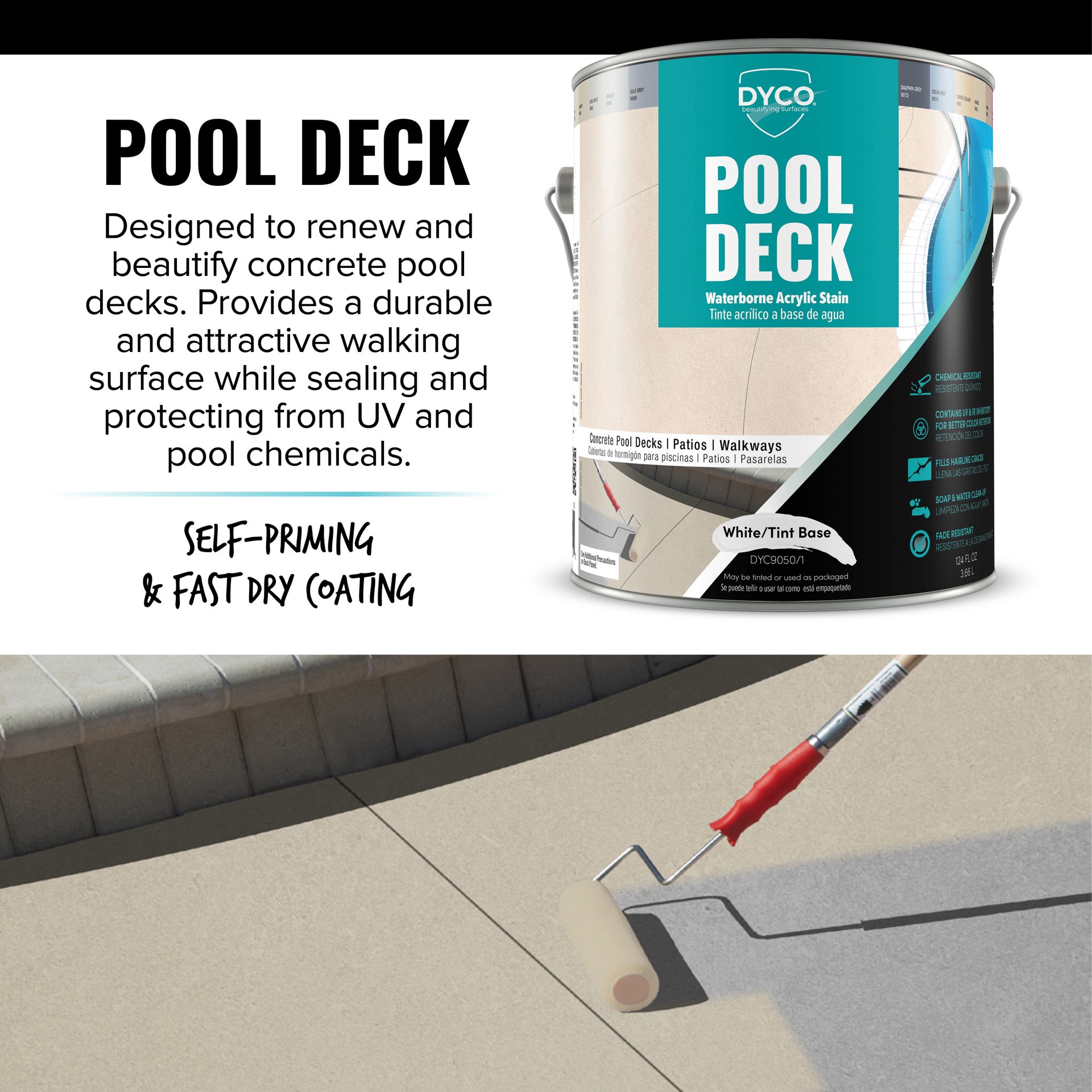 WATERBORNE ACRYLIC FINISH: With its superior film properties, Dyco Pool Deck Tint Base Waterborne Acrylic Stain provides a low sheen hard protective finish on concrete surfaces.. FINISH YOUR SPACES: D…