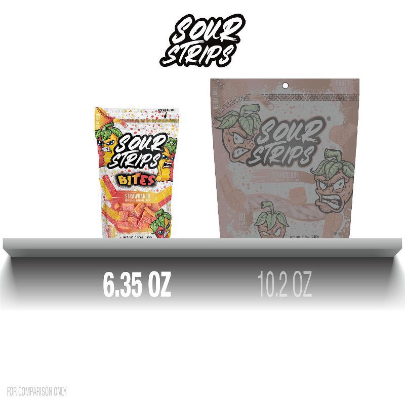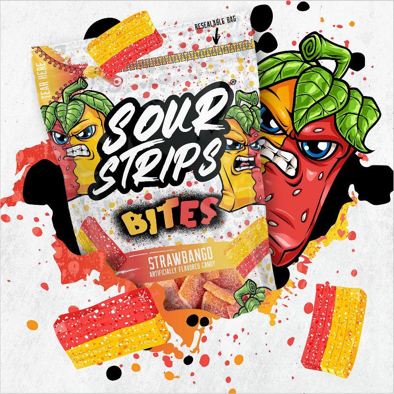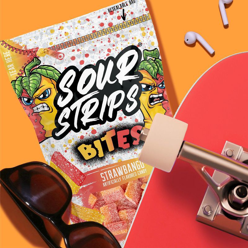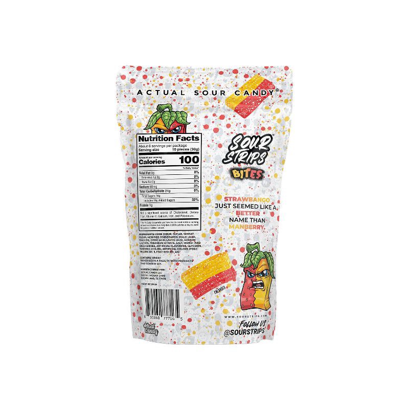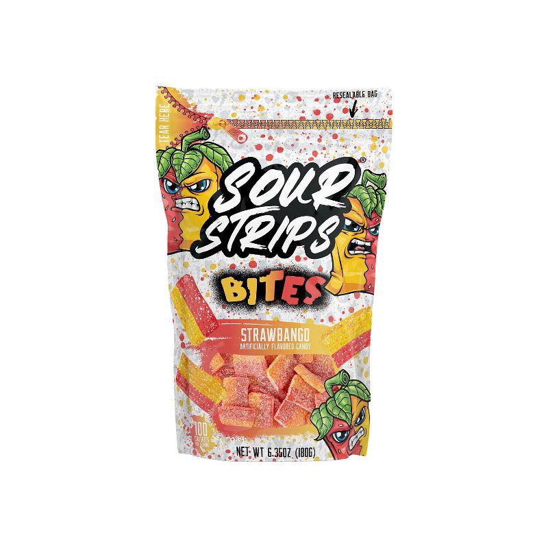 - Contains one (1) 6.35-ounce bag of SOUR STRIPS Bites Strawbango Flavored Chewy Candy
