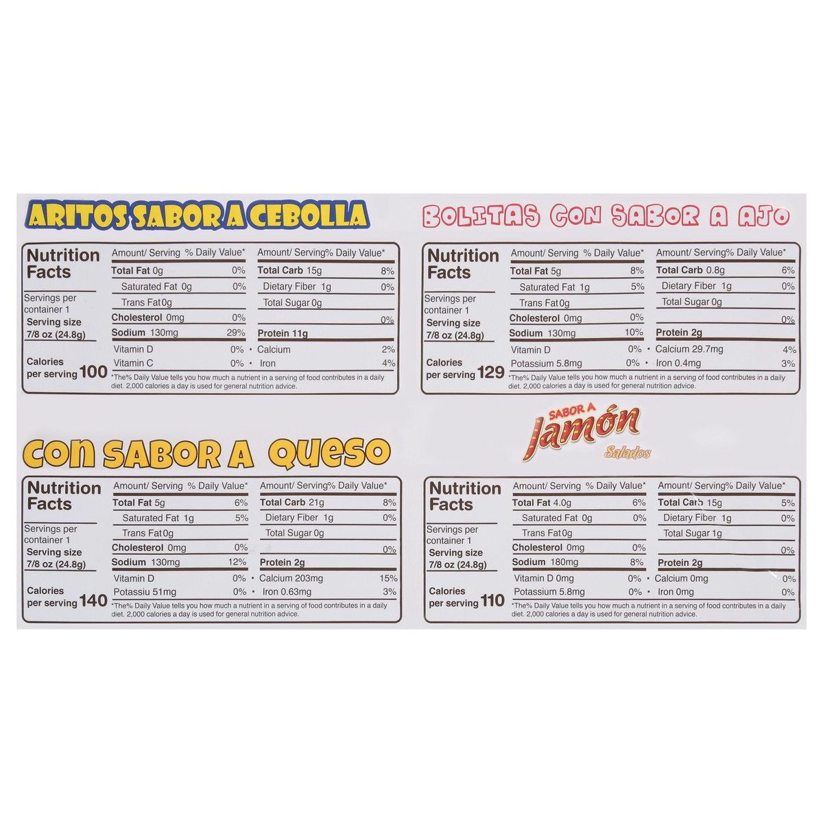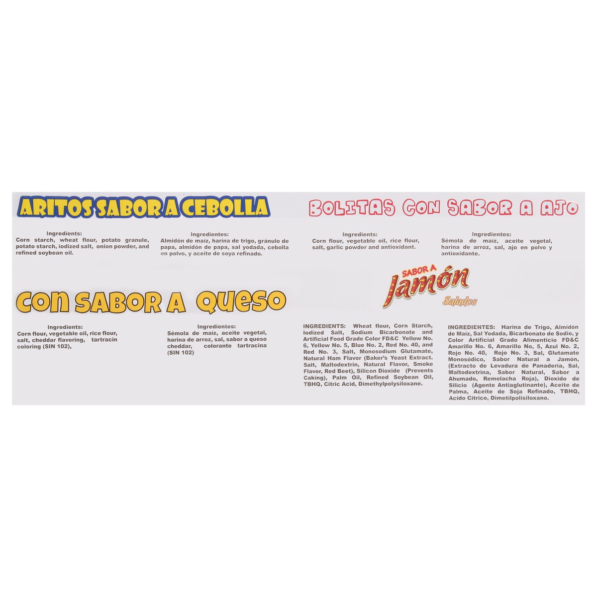 Aritos Sabora Cebolla: Corn Starch, Wheat Flour, Potato Granule, Potato Starch, Iodized Salt, Onion Powder, and Refined Soybean Oil. Sabor A Jamon Salados: Wheat Flour, Corn Starch, Iodized Salt, Sodi…