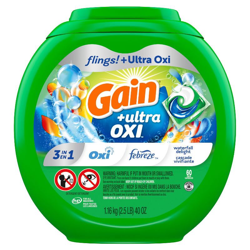 - Includes one 60 count tub of Gain Flings Laundry Detergent Pacs in Gain Waterfall Delight scent