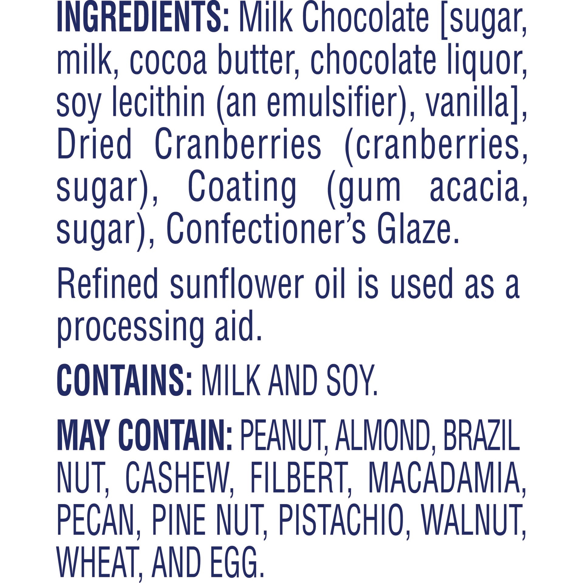 Milk Chocolate [Sugar, Milk, Chocolate, Skim Milk, Cocoa Butter, Milk Fat, Soy Lecithin (an Emulsifier), Natural Flavor], Dried Cranberries (Sugar, Cranberries), Coating (Gum Acacia, Sugar), Confectio…