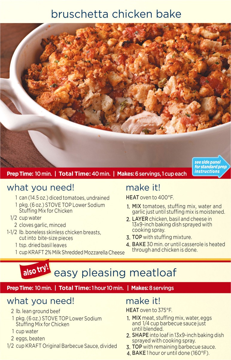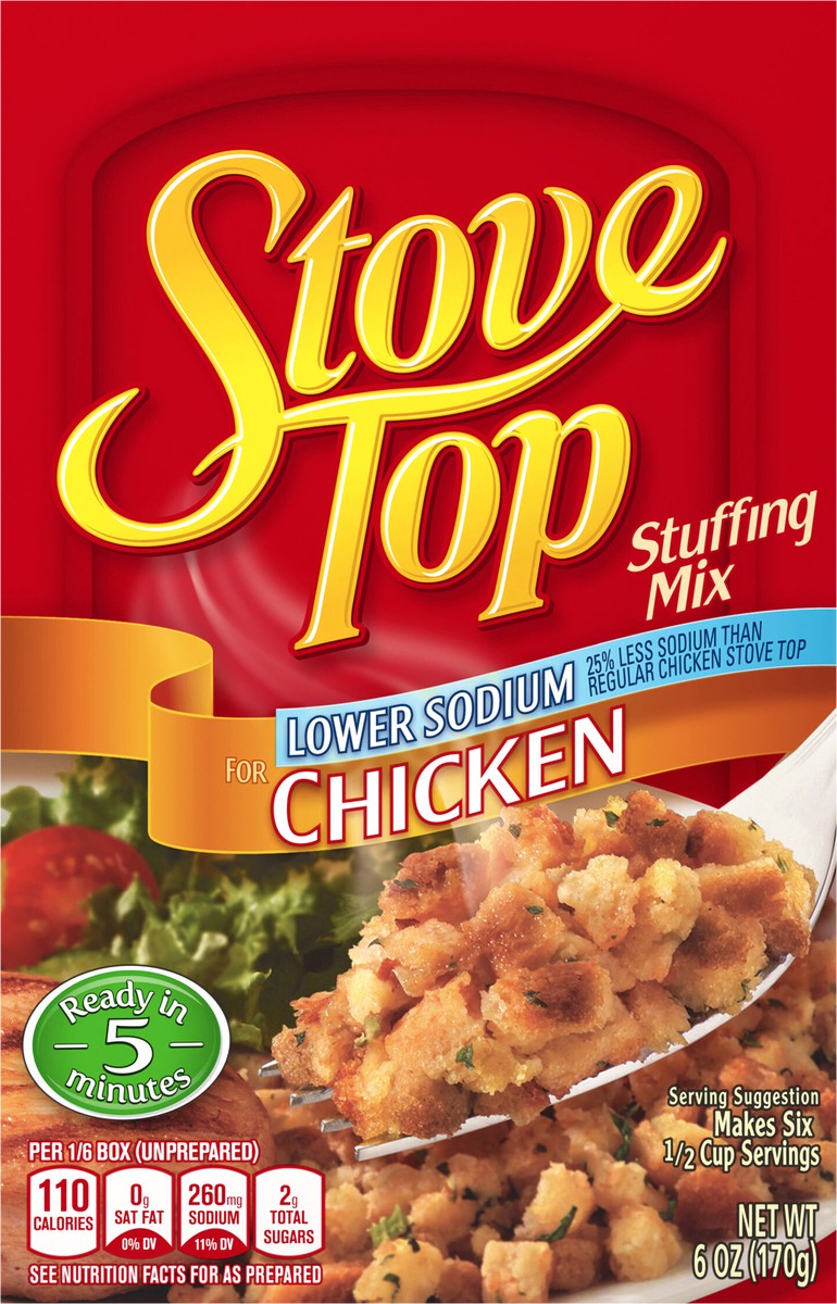 Make any family dinner something to celebrate with Kraft Stove Top Lower Sodium Chicken Stuffing Mix, featuring 25% less sodium than regular Stove Top Chicken Stuffing. A mix of fresh baked bread crum…