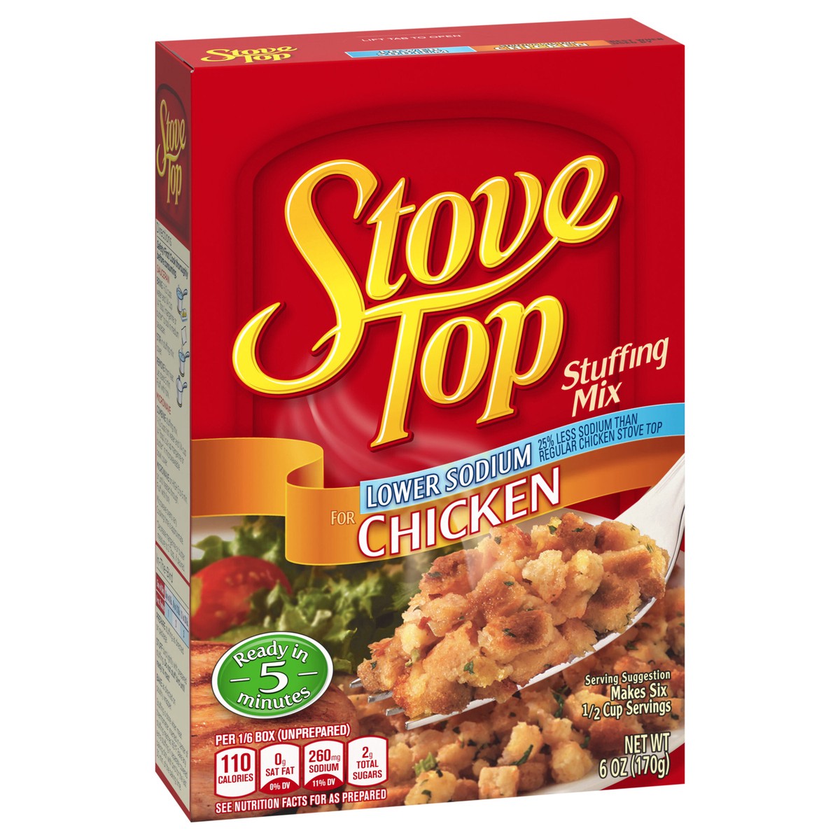 Make any family dinner something to celebrate with Kraft Stove Top Lower Sodium Chicken Stuffing Mix, featuring 25% less sodium than regular Stove Top Chicken Stuffing. A mix of fresh baked bread crum…