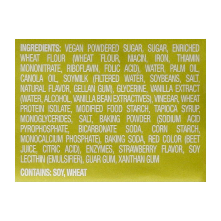 Vegan Powdered Sugar, Sugar, Enriched Wheat Flour (Wheat Flour, Niacin, Iron, Thiamin Mononitrate, Riboflavin, Folic Acid), Water, Palm Oil Canola Oil, Soymilk (Filtered Water, Soybeans, Salt Natural …