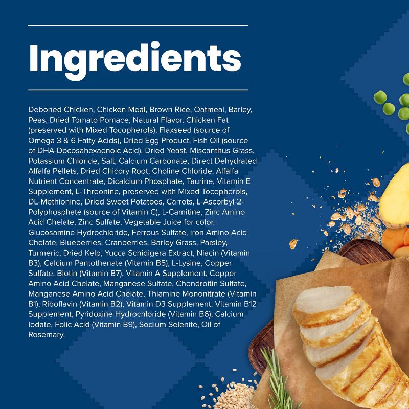 Deboned Chicken, Chicken Meal, Brown Rice, Oatmeal, Barley, Peas, Dried Tomato Pomace, Natural Flavor, Chicken Fat (Preserved with Mixed Tocopherols), Flaxseed (Source of Omega 3 & 6 Fatty Acids), Dri…