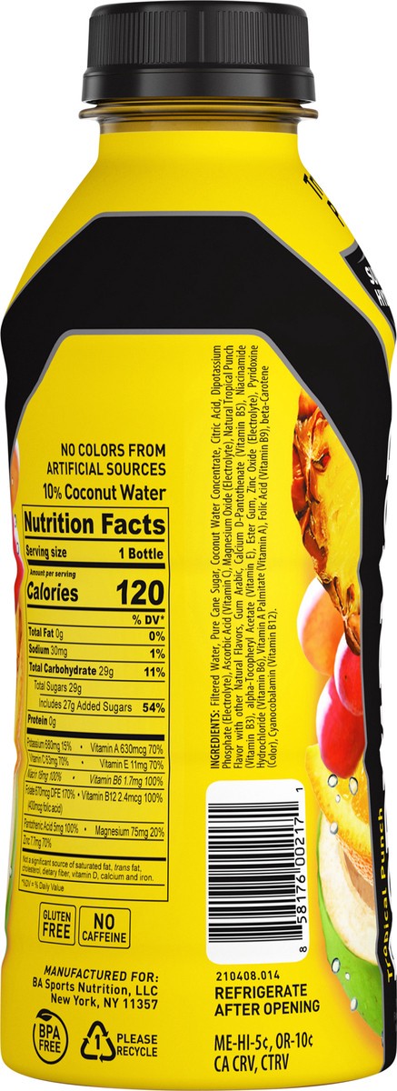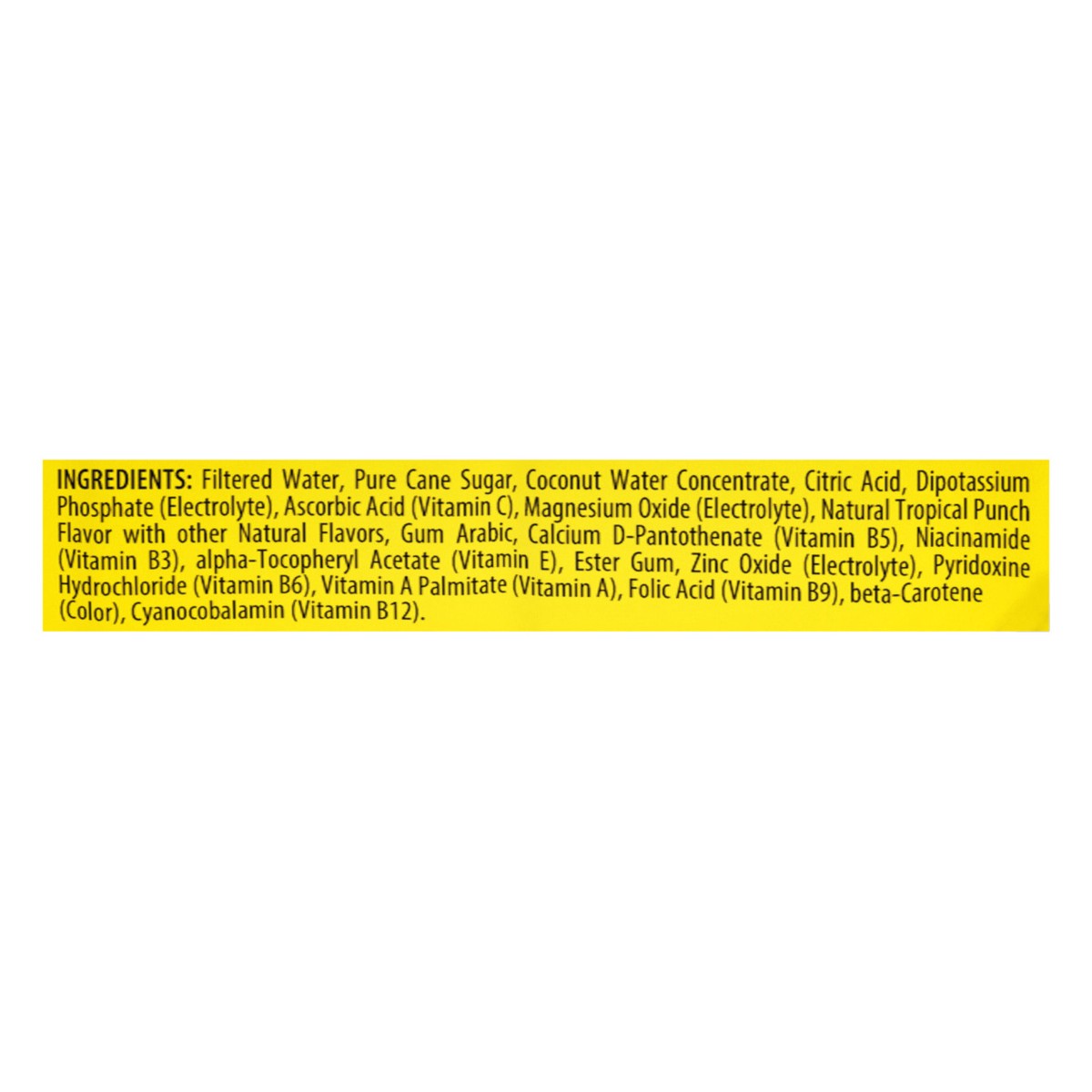 Filtered Water, Pure Cane Sugar, Coconut Water Concentrate, Citric Acid, Dipotassium Phosphate (Electrolyte), Ascorbic Acid (Vitamin C), Magnesium Oxide (Electrolyte), Natural Tropical Punch Flavor Wi…
