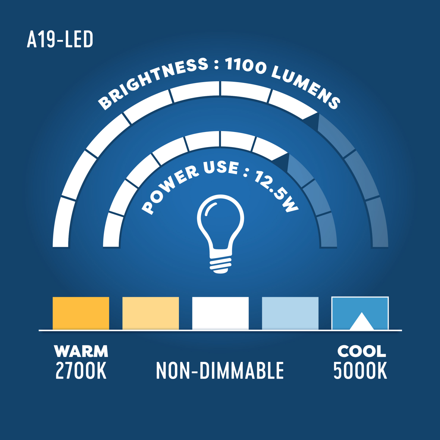 12.5 watt A19 LED bulb provides 1100 lumens and replaces 75 watt incandescent bulb for over 83% energy savings. 5000K color of light is standard. Great for use in table lamps, floor lamps, wall sconce…