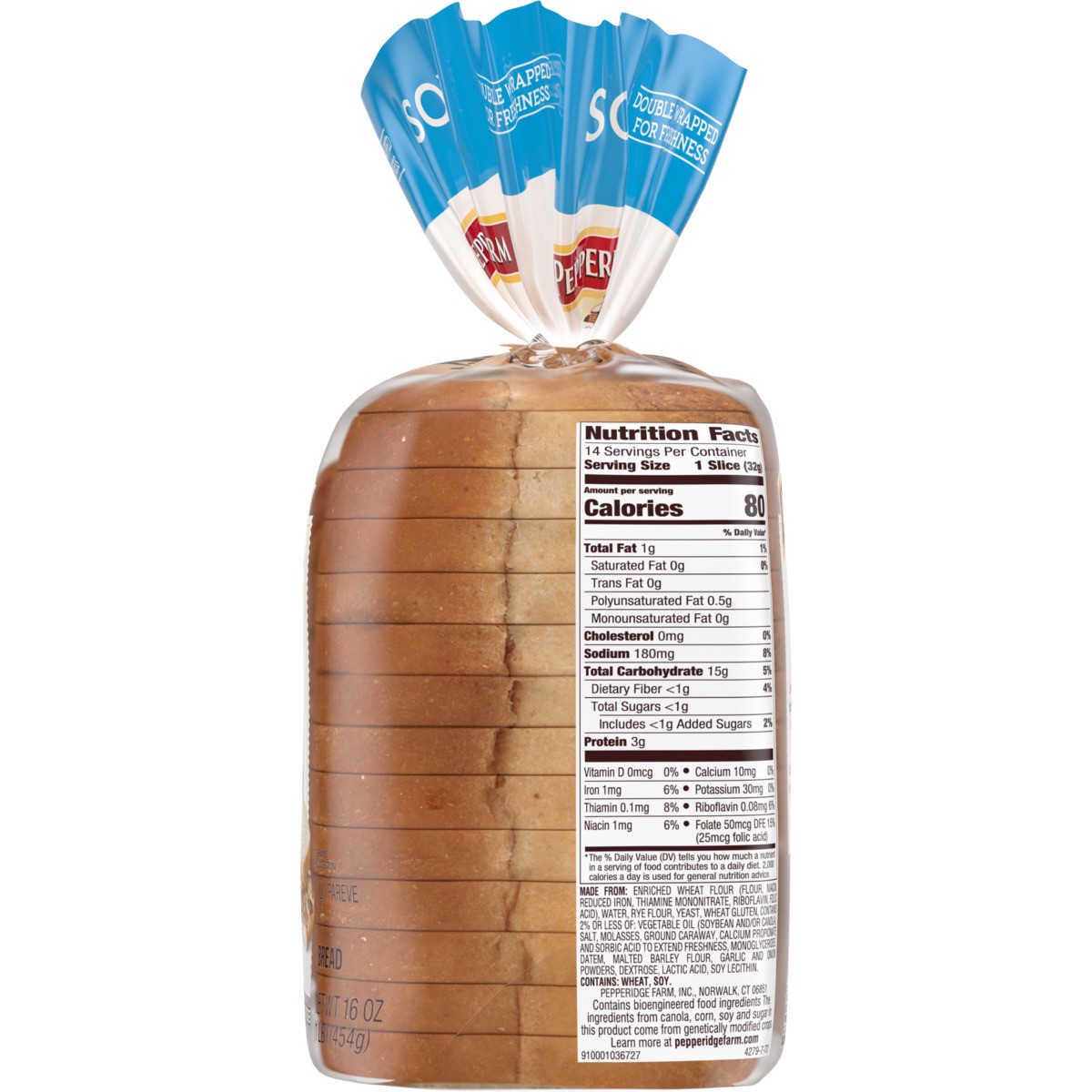MADE FROM: ENRICHED WHEAT FLOUR (FLOUR, NIACIN, REDUCED IRON, THIAMINE MONONITRATE, RIBOFLAVIN, FOLIC ACID), WATER, RYE FLOUR, YEAST, WHEAT GLUTEN, CONTAINS 2% OR LESS OF: VEGETABLE OIL (SOYBEAN AND/O…