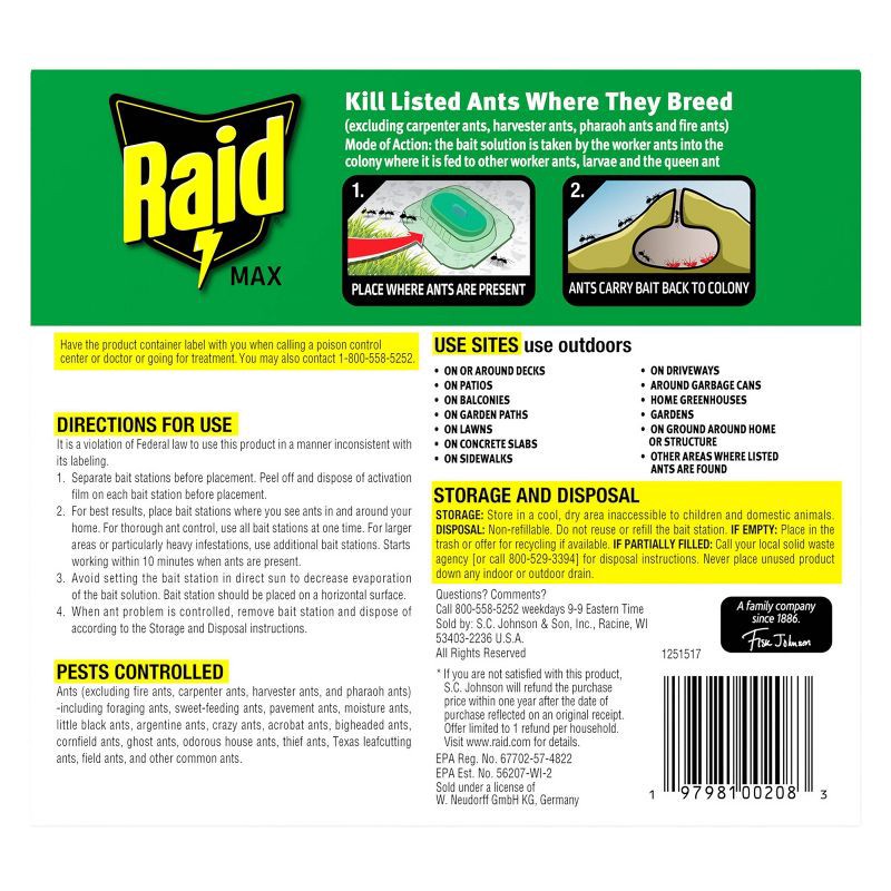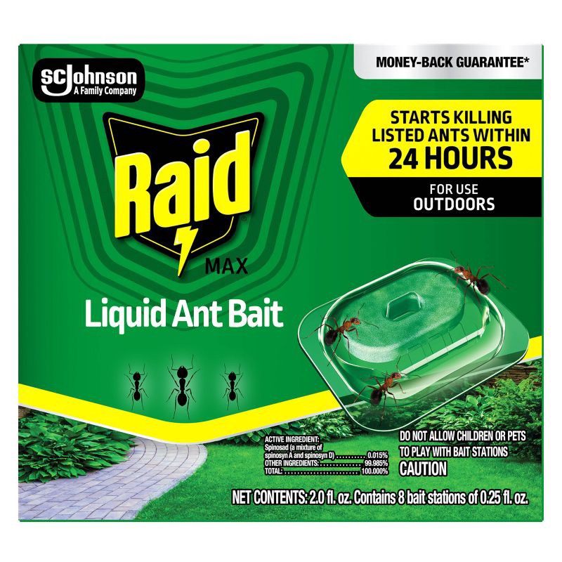 Outdoor ant problems? Here today, gone tomorrow with Raid Outdoor Liquid Ant Bait. Kills listed ants where they breed, including the queen and colony. Just put down a spill-proof bait station in the c…