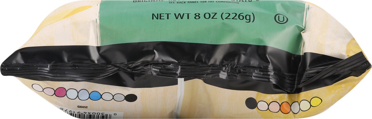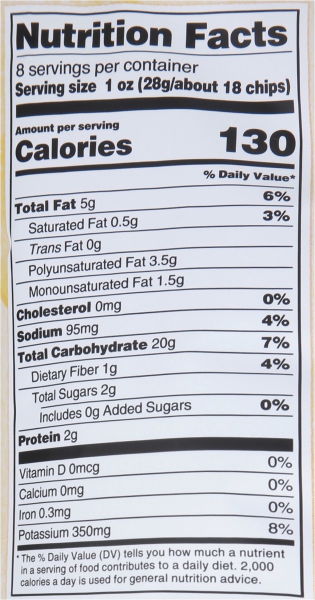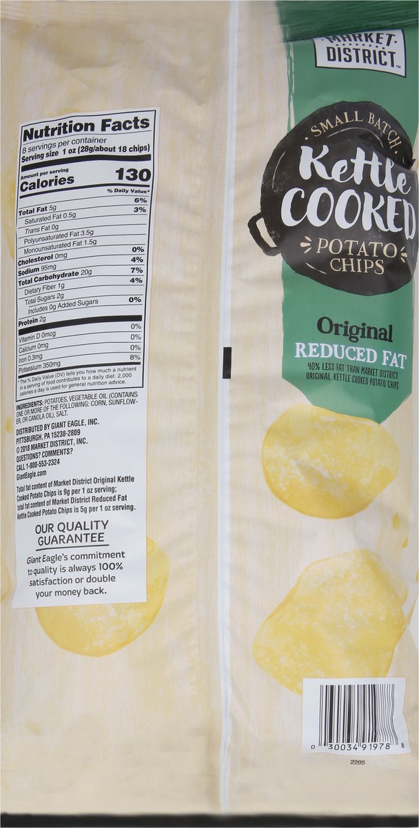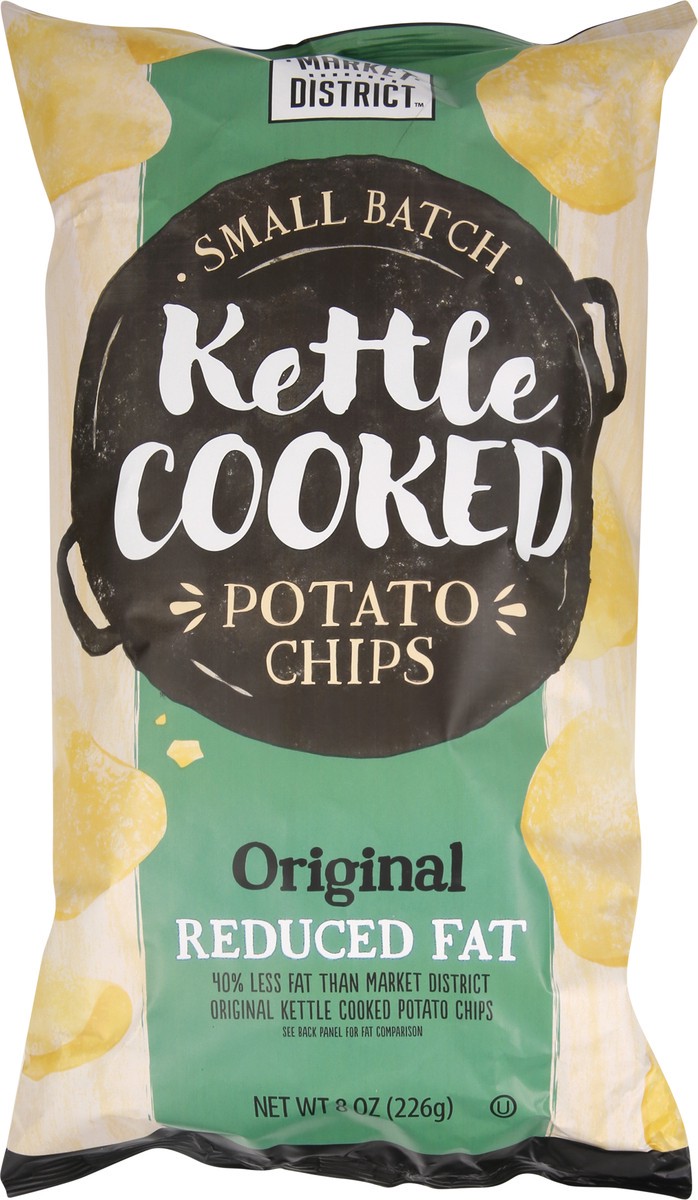 Total fat content of Market District Original Kettle Cooked Potato Chips is 9 g per 1 oz serving; total fat content of Market District Reduced Fat Kettle Cooked Potato Chips is 5 g per 1 oz serving. S…