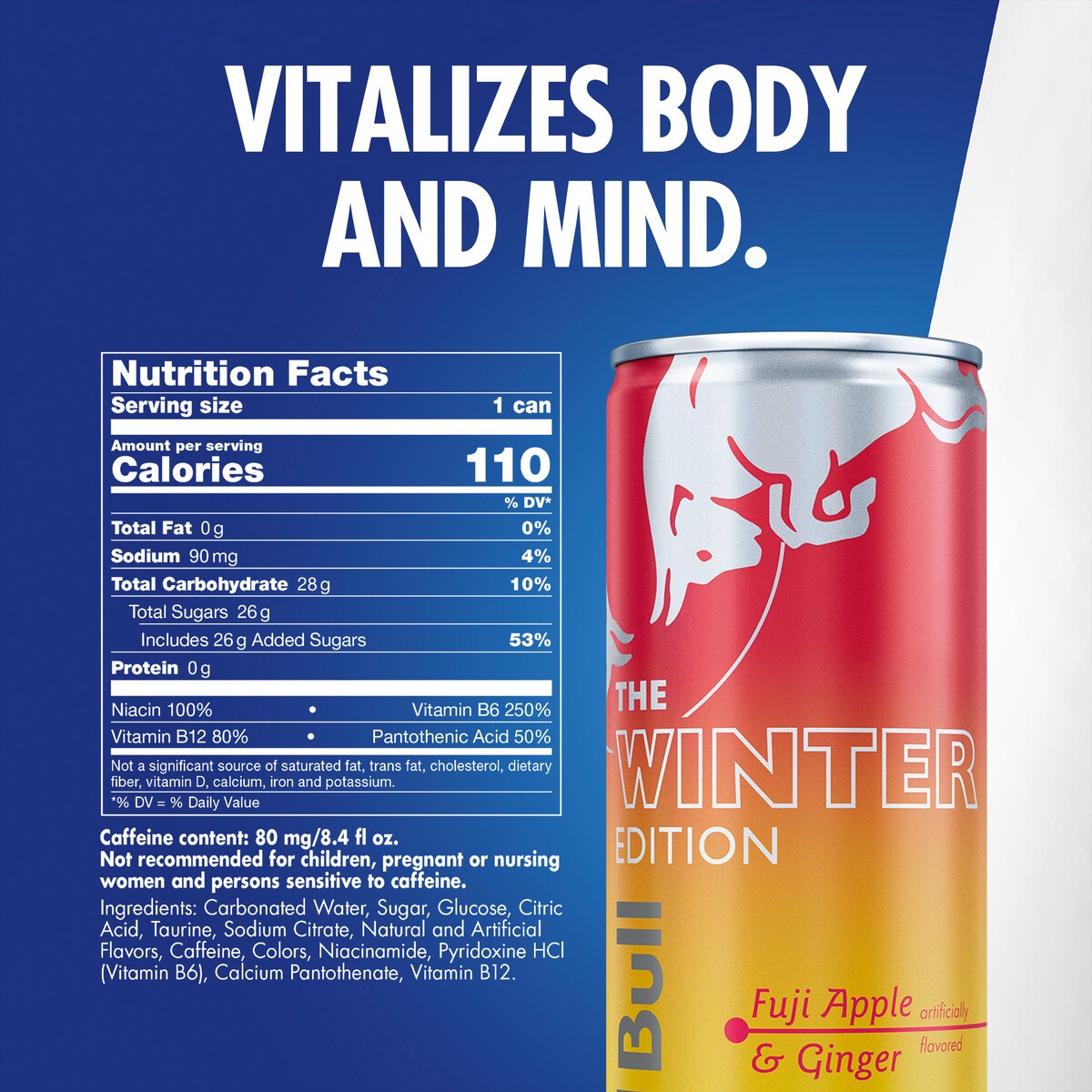 - Enjoy the taste of juicy Fuji Apple with a touch of Ginger in the Red Bull Winter Edition; Features taurine, an amino acid, plus four essential B-group vitamins B3, B6, B12 and B5, which contribute to normal energy-yielding metabolism