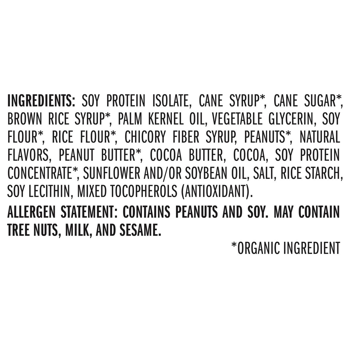Soy Protein Isolate, Cane Syrup*, Cane Sugar*, Brown Rice Syrup*, Palm Kernel Oil, Vegetable Glycerin, Soy Flour*, Rice Flour*, Chicory Fiber Syrup, Peanuts*, Natural Flavors, Peanut Butter*, Cocoa Bu…