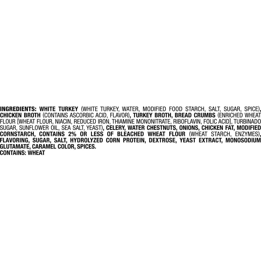 Made with White TurkeyIngredients: Turkey Broth, White Turkey (White Turkey, Water, Modified Food Starch, Salt, Sugar, Spice), Bread Crumbs (Enriched Wheat Flour [Wheat Flour, Niacin, Reduced Iron, Th…