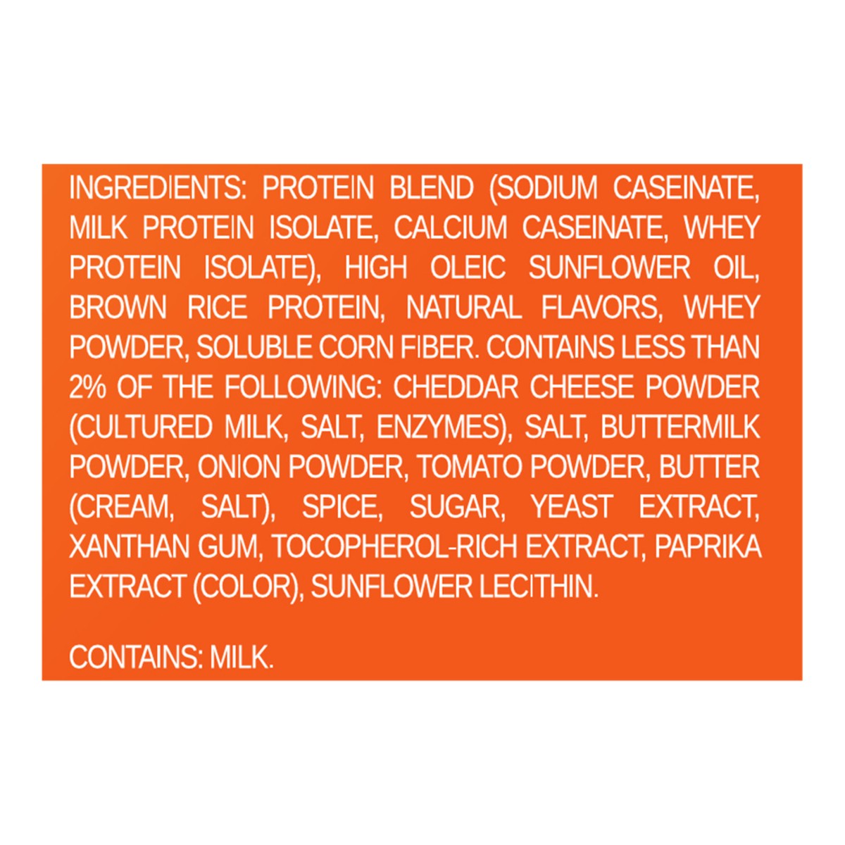 Protein Blend (Sodium Caseinate, Milk Protein Isolate, Calcium Caseinate, Whey Protein Isolate), High Oleic Sunflower Oil, Brown Rice Protein, Natural Flavors, Whey Powder, Soluble Corn Fiber, Contain…