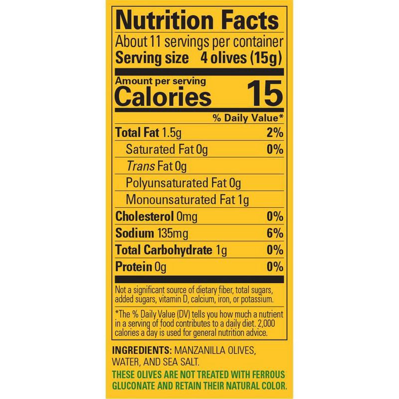 Olives, Water, Sea Salt, Ferrous Gluconate (added to stabilize color)