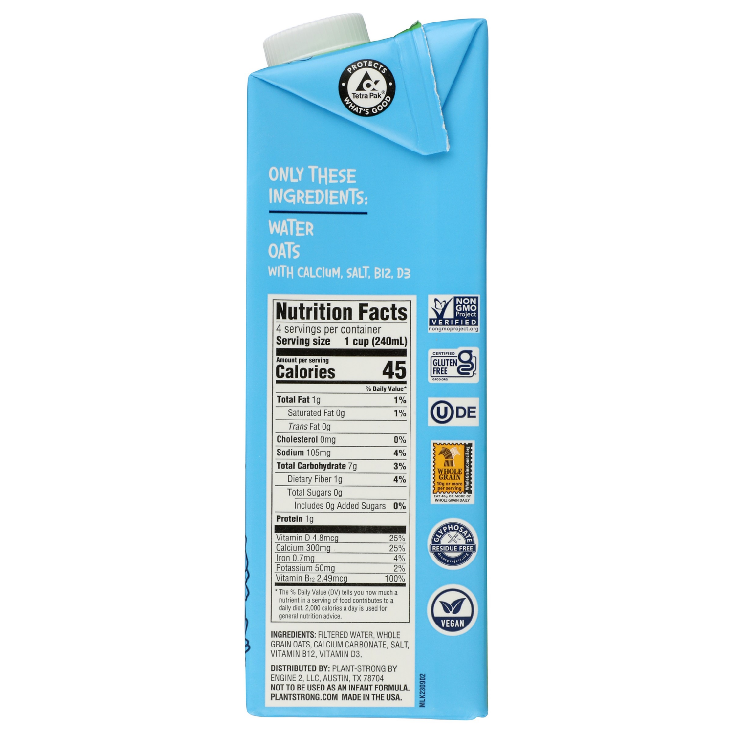 FILTERED WATER, WHOLE GRAIN OATS, CALCIUM CARBONATE, SALT, VITAMIN B12, VITAMIN D3.' '