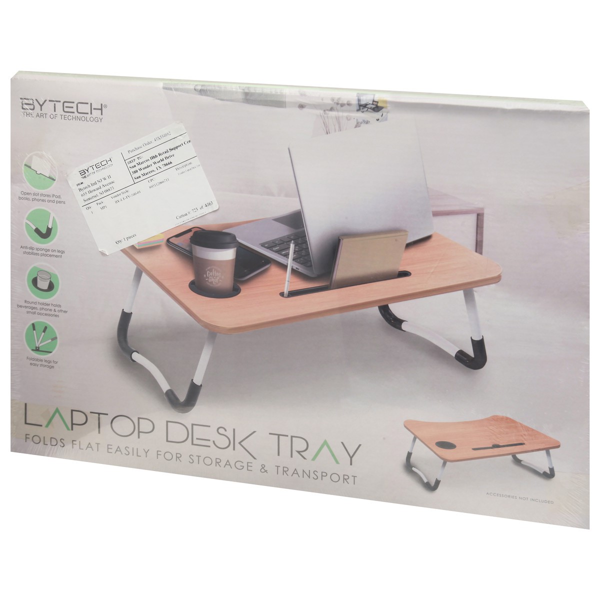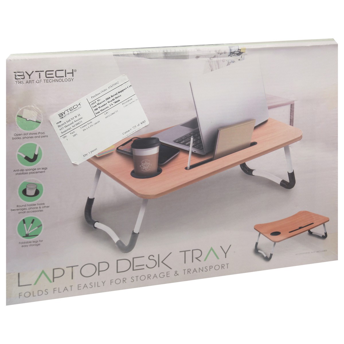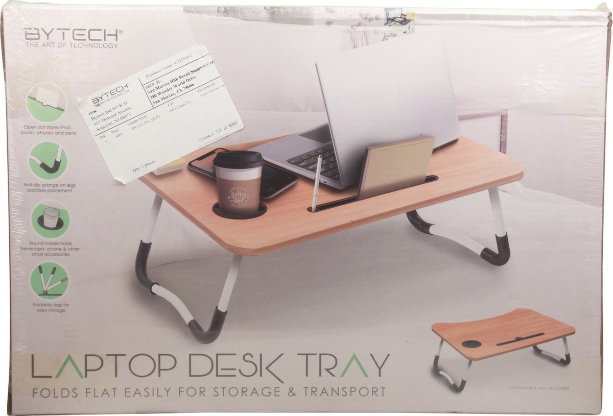The art of technology. Open slot stores iPad, books, phones and pens. Anti-slip sponge on legs stabilizes placement. Round holder holds beverages, phone & other small accessories. Foldable legs for ea…