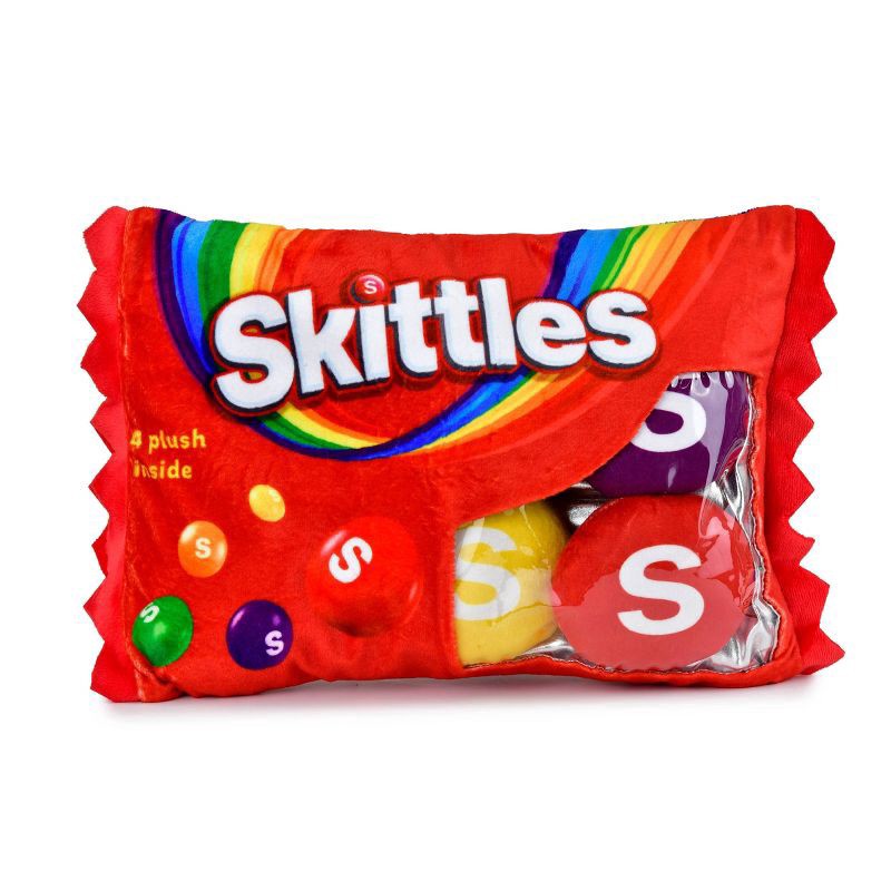 Add a touch of whimsy to your room with this big "bag" of sweet candy treats! This officially licensed pillow set features a fleece zipper bag with a clear window, showcasing four candy-colored Skittl…