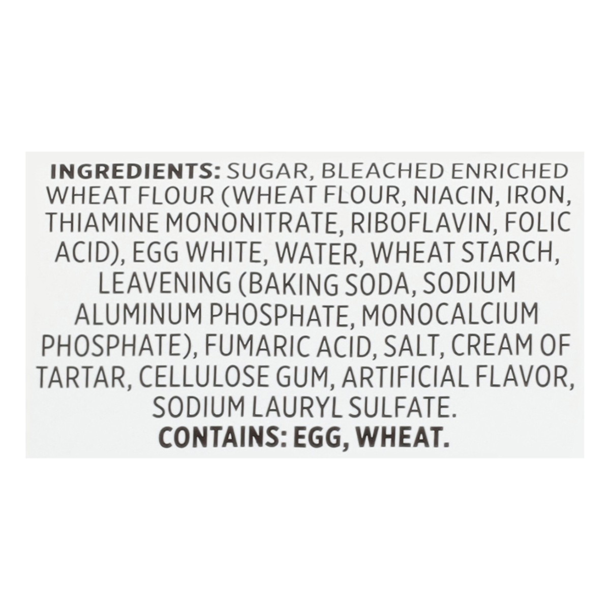 Sugar, Bleached Enriched Wheat Flour (Wheat Flour, Niacin, Iron, Thiamine Mononitrate, Riboflavin, Folic Acid), Egg White, Water, Wheat Starch, Leavening (Baking Soda, Sodium Aluminum Phosphate, Monoc…