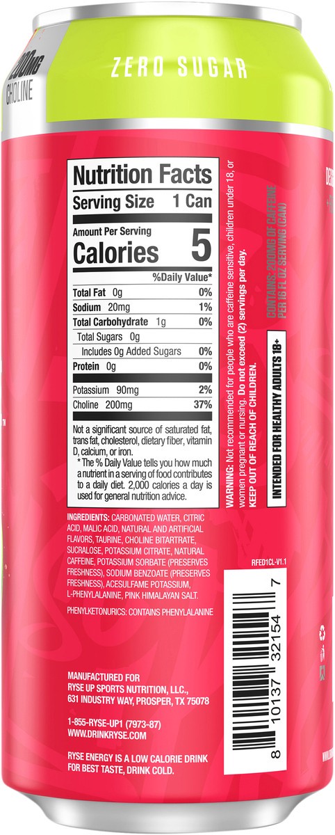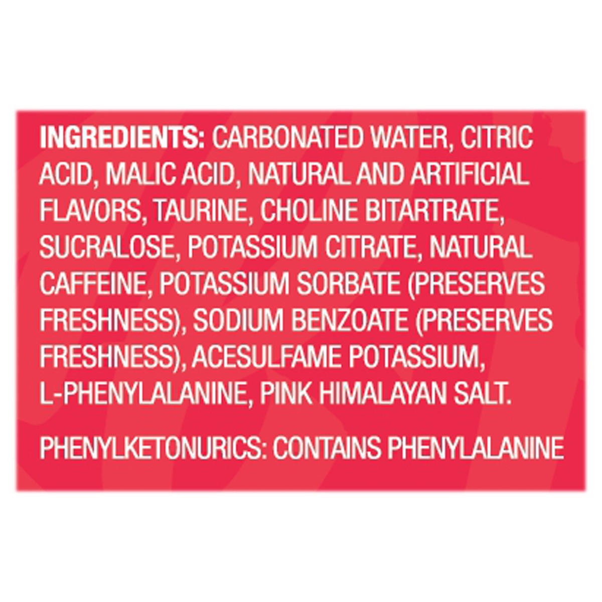 Carbonated Water, Citric Acid, Malic Acid, Natural and Artificial Flavors, Taurine, Choline Bitartrate, Sucralose, Potassium Citrate, Natural Caffeine, Potassium Sorbate (Preserves Freshness), Sodium …