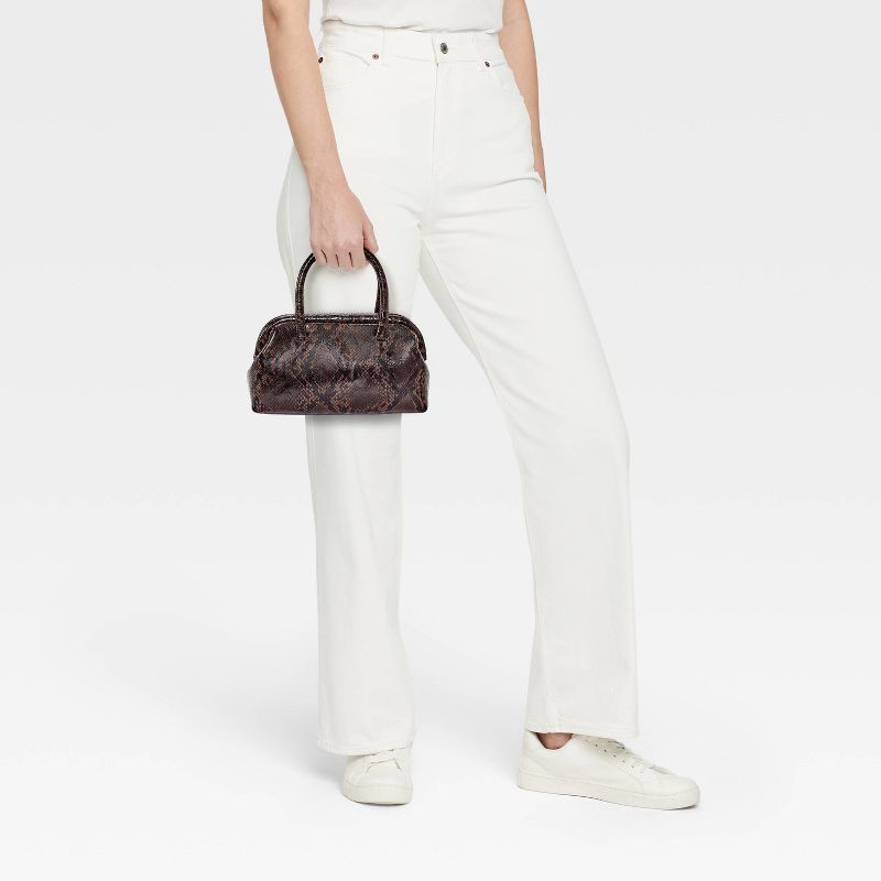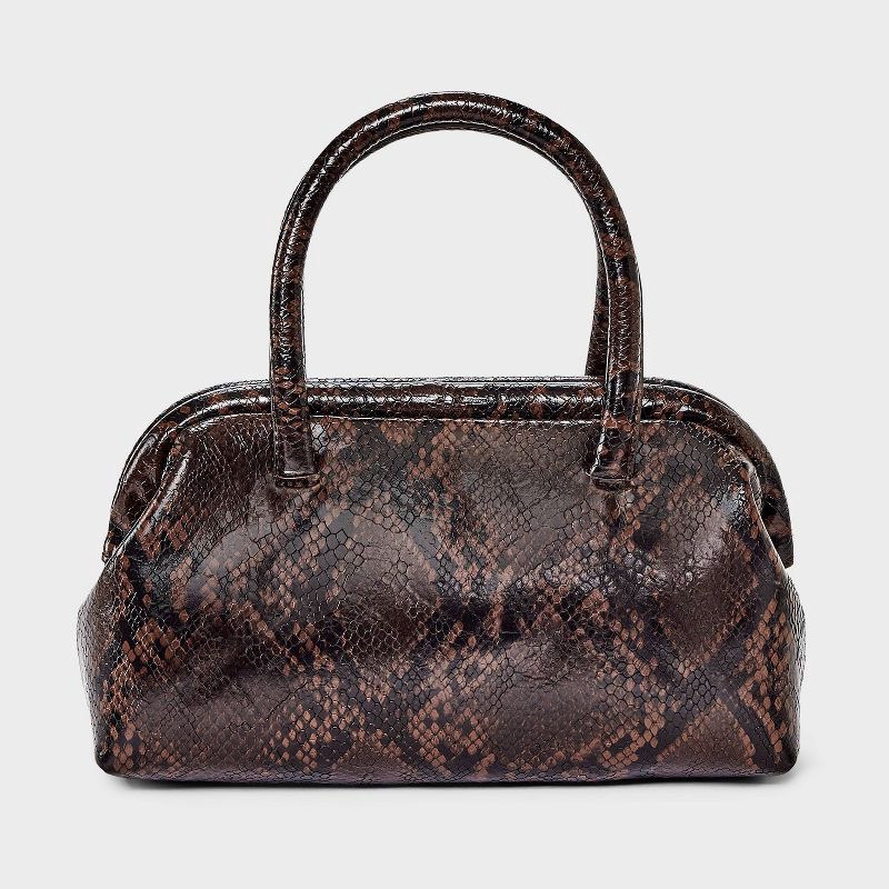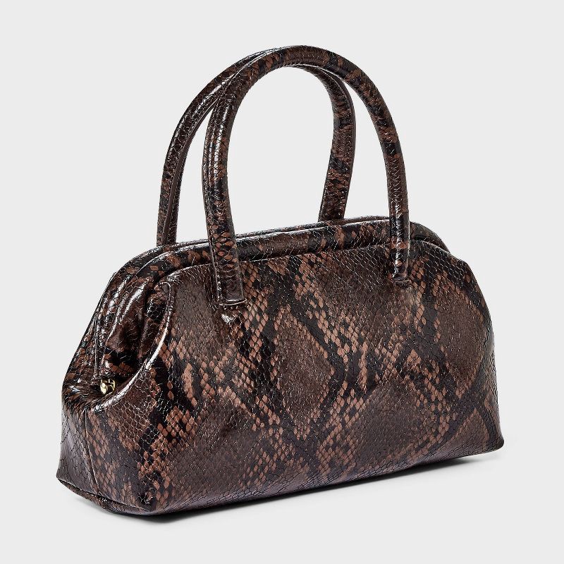 Spruce up your cool and trendy look with this Snake Print Frame Satchel Handbag from A New Day™. Featuring a polyurethane shell, this frame satchel handbag features snake print in a brown hue for an e…