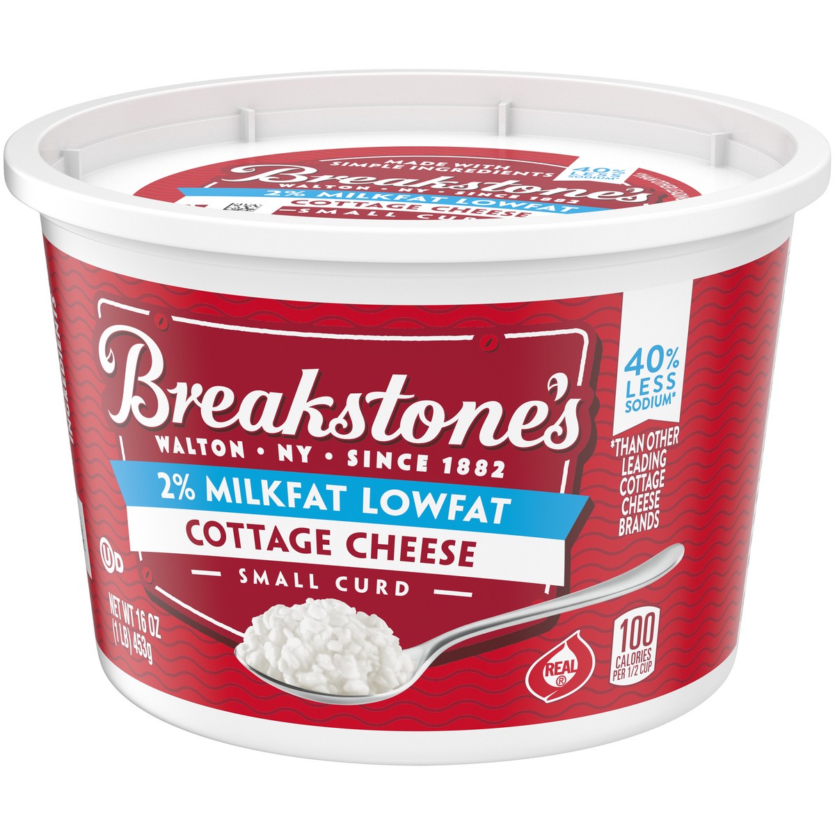 Breakstone's Small Curd 2% Milkfat Lowfat Cottage Cheese with Low Sodium contains 45% less sodium than other leading cottage cheese brands. This small curd cottage cheese is made with cultured pasteur…