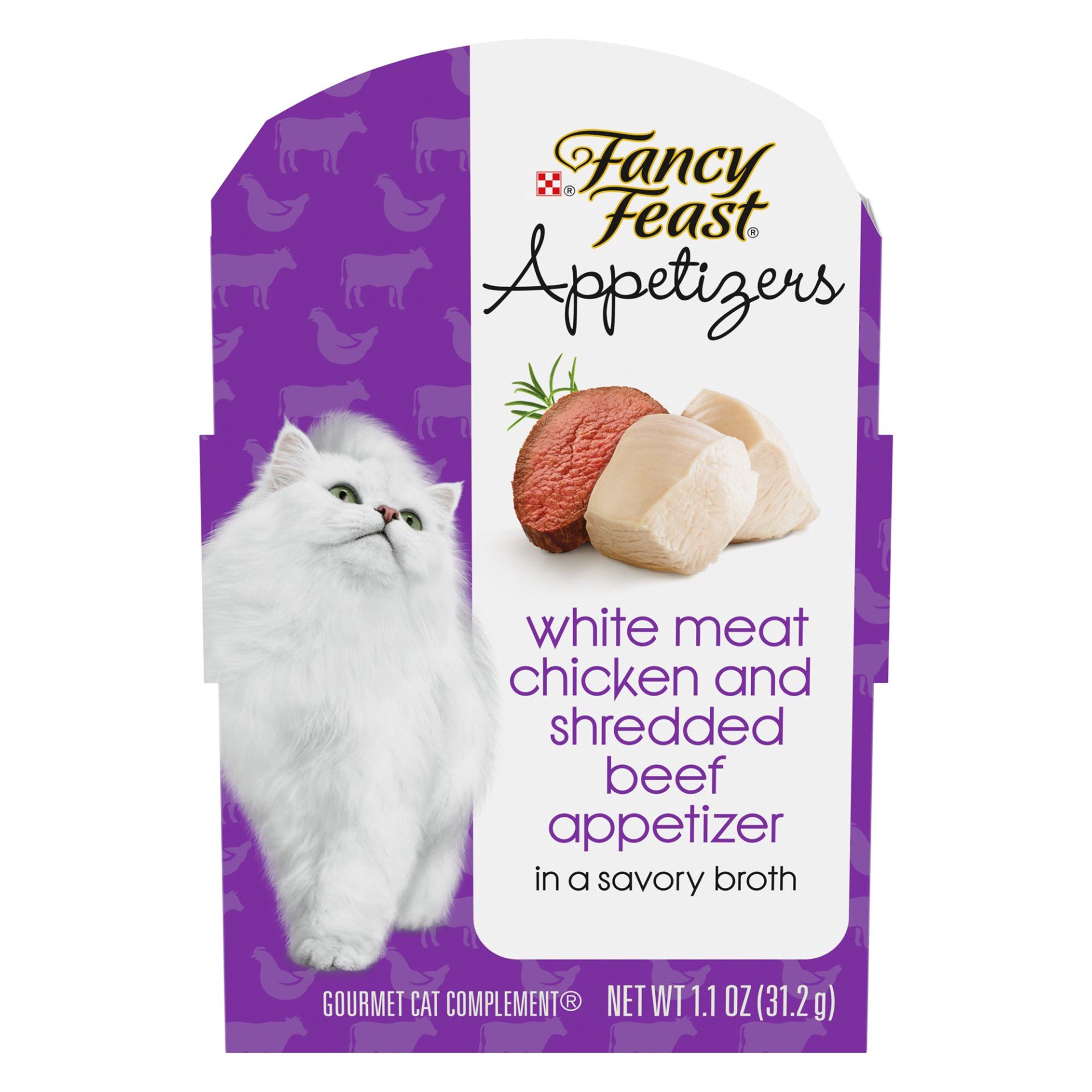 - This Fancy Feast wet cat food chicken and beef appetizer complement is part of the complete line of Purina Fancy Feast gourmet cat foods
