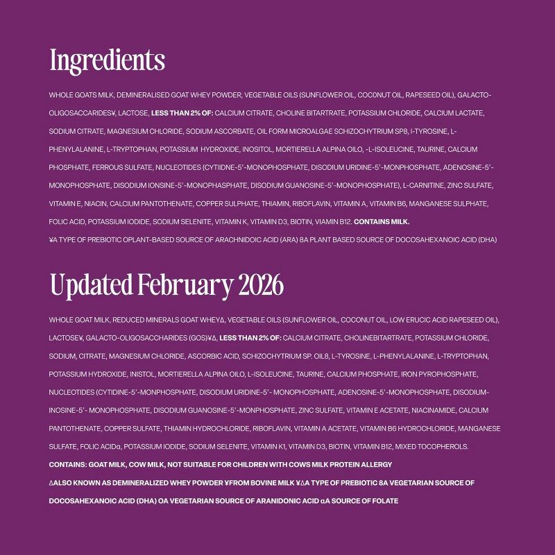 WHOLE GOAT MILK, REDUCED MINERALS GOAT WHEY^, BLEND OF OILS (SUNFLOWER OIL, COCONUT OIL, LOW ERUCIC ACID RAPESEED OIL), LACTOSE^, GALACTO-OLIGOSACCHARIDES (GOS)^*, LESS THAN 2% OF: CALCIUM CITRATE, CH…