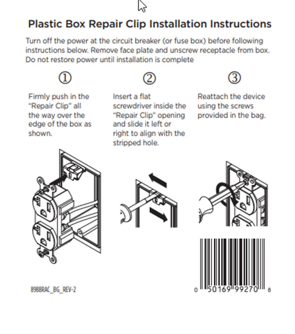 Repairs stripped mounting holes in the box. Eliminates the need to replace the plastic electrical box. Slides easily to align screw holes. Saves time and money for property managers and DIYers.